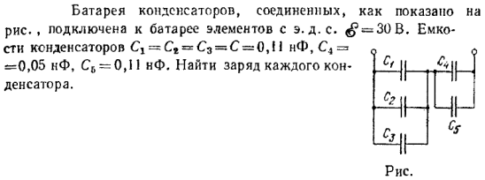 Батарея конденсаторов, соединенных, как показано на рис. , подключена к батарее элементов с э.д.с. E = 30 В. Емкости конденсаторов С1 = С2 = С3 = С = 0,11 нФ,С4 = 0,05 нФ, С5 = 0,11 нФ. Найти заряд каждого конденсатора.