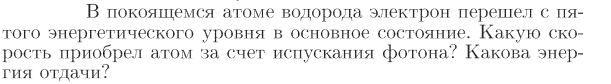 В покоящемся атоме водорода электрон перешел с пятого энергетического уровня в основное состояние. Какую скорость приобрел атом за счет испускания фотона? Какова энергия отдачи?
