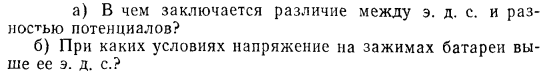 а) В чем заключается различие между э. д. с. и разностью потенциалов? б) При каких условиях напряжение на зажимах батареи выше ее э.д.с?
