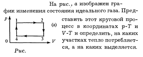 На рис.а изображен график изменения состояния идеального газа. Представить этот круговой процесс в координатах р-Т и V-T и определить, на каких участках тепло потребляется, а на каких выделяется.