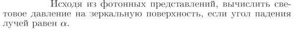 Исходя из фотонных представлений, вычислить световое давление на зеркальную поверхность, если угол падения лучей равен а.