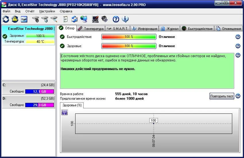 Hard Disk Sentinel - программа для мониторинга и контроля состояния жестких дисков. Позволяет определить потенциальные проблемы, снижение производительности и возможные сбои. В случае обнаружение каких-либо неполадок или превышения температуры Hard Disk Sentinel тут же известит об этом пользователя. Программа отслеживает статус жестких дисков, включая показатели температур и параметры S.M.A.R.T. Кроме этого, измеряет скорость передачи данных в реальном режиме. Данную возможность можно использовать, например, для тестирования или определения случаев заниженной производительности.