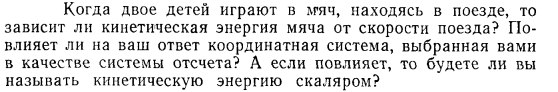 Когда двое детей играют в мяч, находясь в поезде, то зависит ли кинетическая энергия мяча от скорости поезда? Повлияет ли на ваш ответ координатная система, выбранная вами в качестве системы отсчета? А если повлияет, то будете ли вы называть кинетическую энергию скаляром?