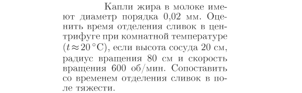 Капли жира в молоке имеют диаметр порядка 0,02 мм. Оценить время отделения сливок в центрифуге при комнатной температуре (t=°C), если высота сосуда 20 см, радиус вращения 80 см и скорость вращения 600 об/мин. Сопоставить со временем отделения сливок в поле тяжести.