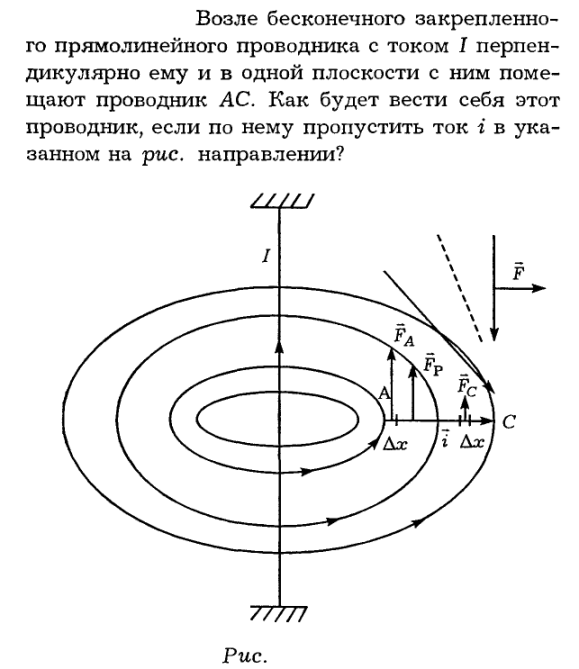 Возле бесконечного закрепленного прямолинейного проводника с током I перпендикулярно ему и в одной плоскости с ним помещают проводник АС. Как будет вести себя этот проводник, если по нему пропустить ток i в указанном на рис. направлении?