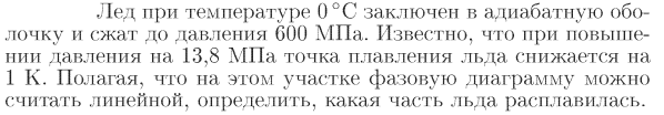 Лед при температуре 0°С заключен в адиабатную оболочку и сжат до давления 600 МПа. Известно, что при повышении давления на 13,8 МПа точка плавления льда снижается на 1 К. Полагая, что на этом участке фазовую диаграмму можно считать линейной, определить, какая часть льда расплавилась.