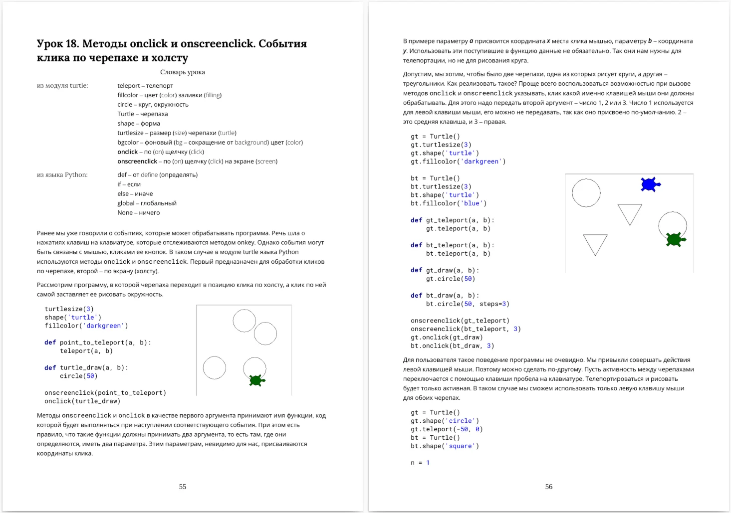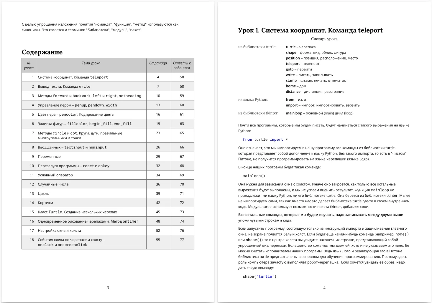 Курс "Turtle. Программирование на Python для школьников" знакомит с основными командами черепашьей графики, реализуемой модулем turtle, а также является введением в язык Python и программирование (рассматриваются циклы, условный оператор, определение функций и др.)