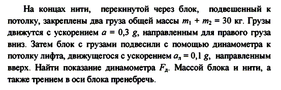 На концах нити, перекинутой через блок, подвешенный к потолку, закреплены два груза общей массы m1 + m2 = 30 кг. Грузы движутся с ускорением a = 0,3 g, направленным для правого груза вниз. Затем блок с грузами подвесили с помощью динамометра к потолку лифта, движущегося с ускорением ал = 0,1 g, направленным вверх. Найти показание динамометра Fд. Массой блока и нити, а также трением в оси блока пренебречь.