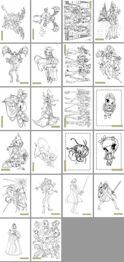 Комплект черно-белых изображений с персонажами мультсериала "Винкс: Школа волшебниц" для распечатки на принтере.