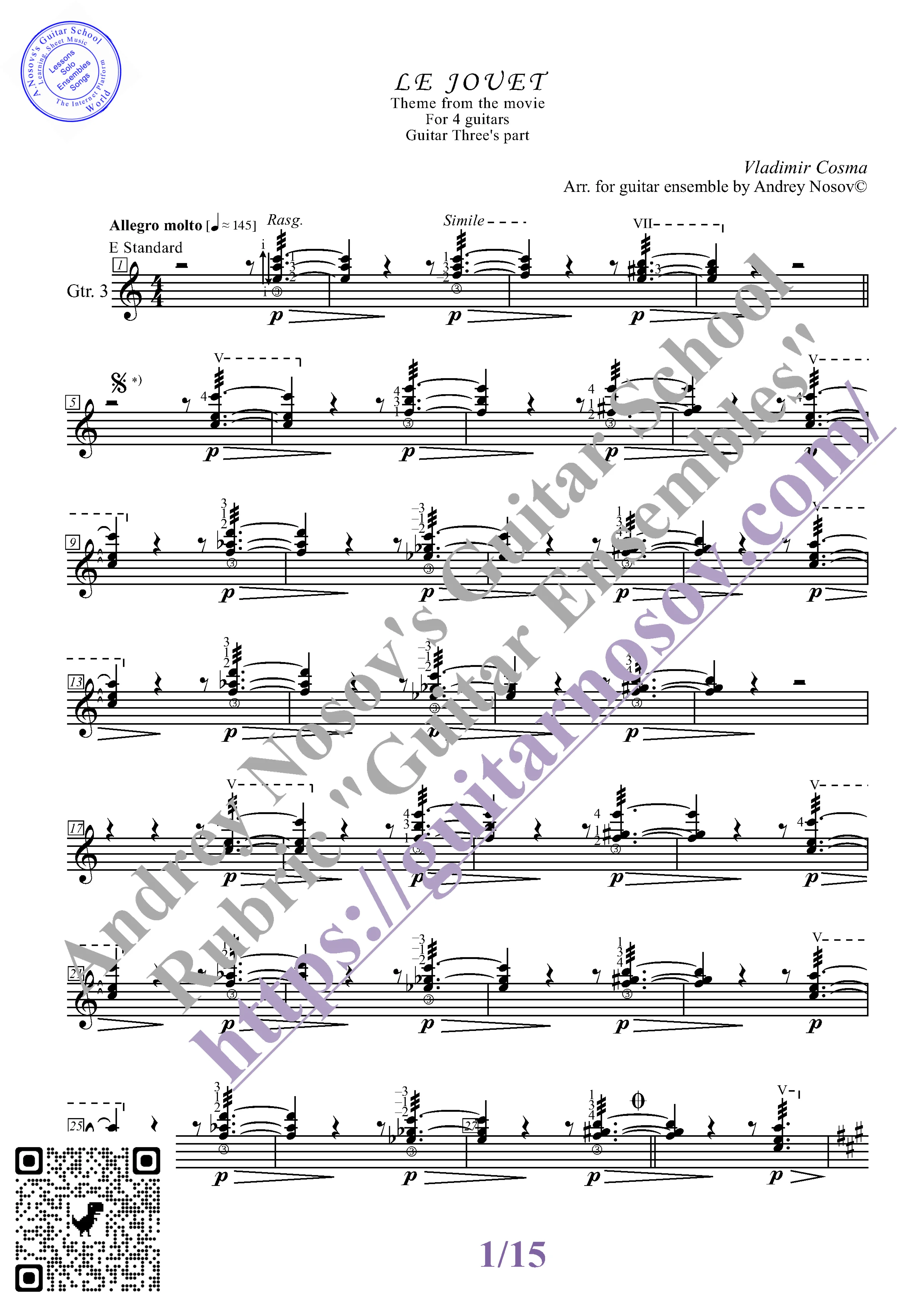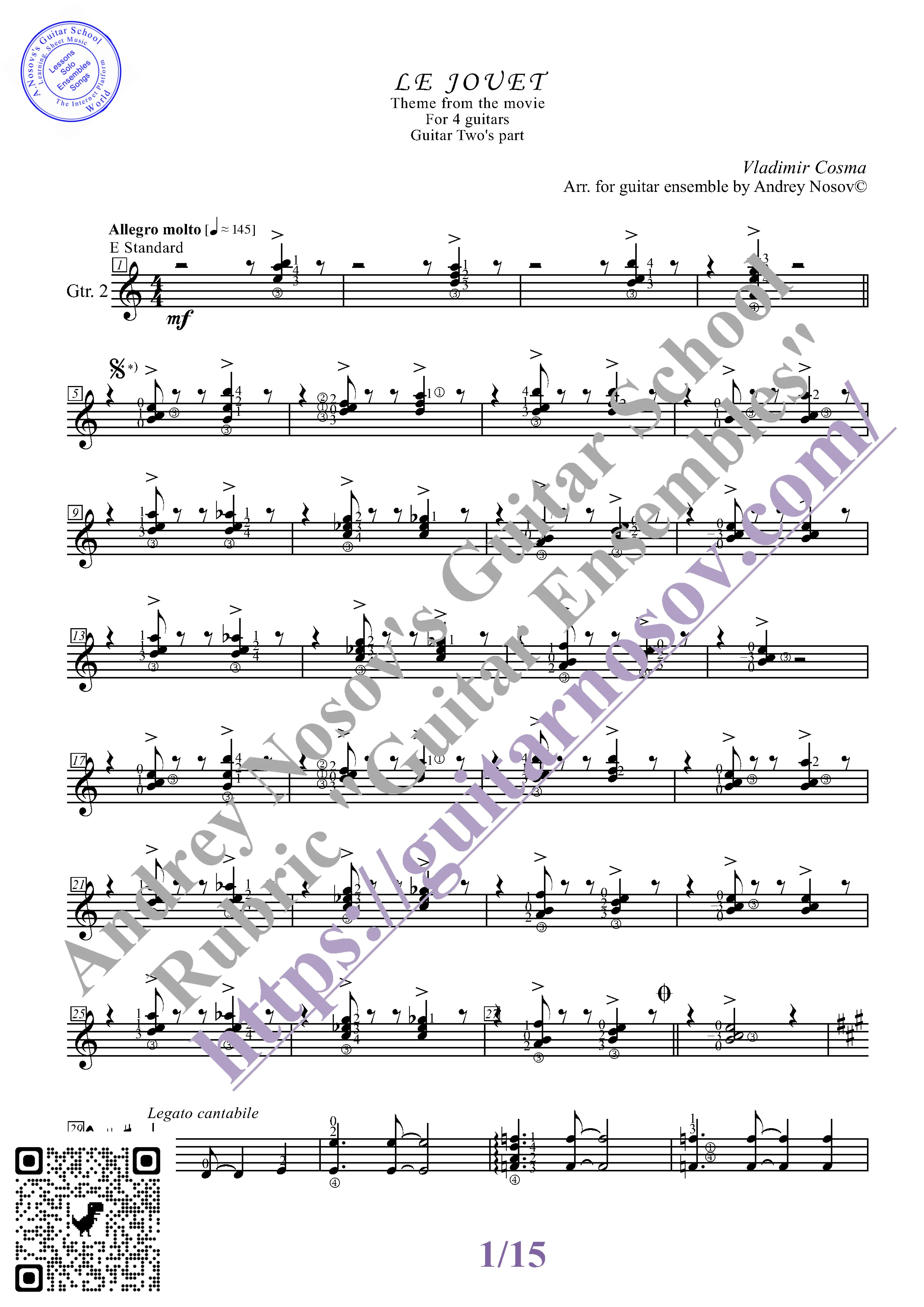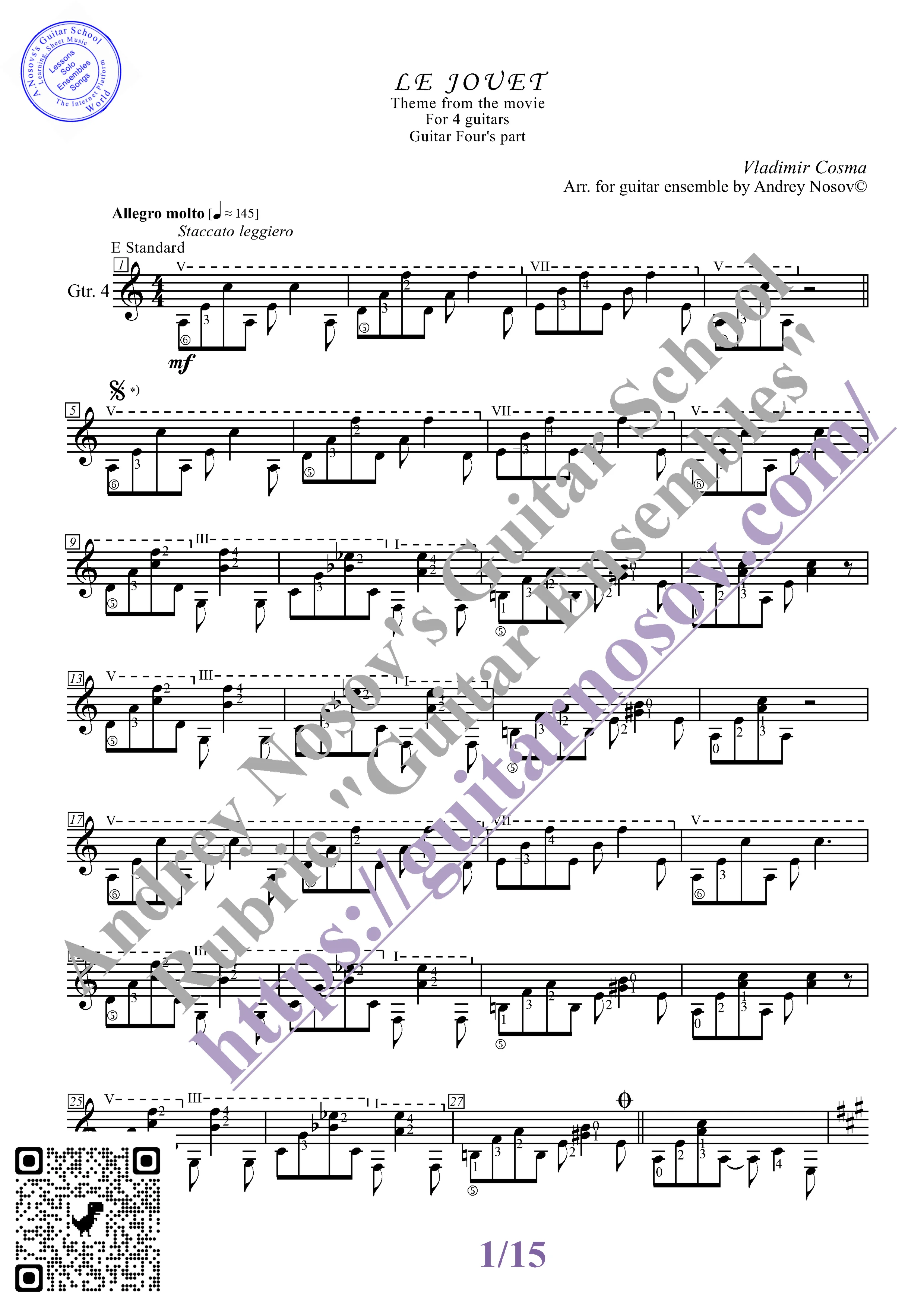 Вашему вниманию предлагается композиция "Le Jouet (V.Cosma)", предназначенная для КВАРТЕТА гитаристов. Запись выполнена нотами и сопровождена подробнейшей аппликатурой. Табулатуры нет. Товар включает в себя партитуру и партии отдельных гитар (в одном PDF). Прилагается ссылка на прослушивание / скачивание mp3.