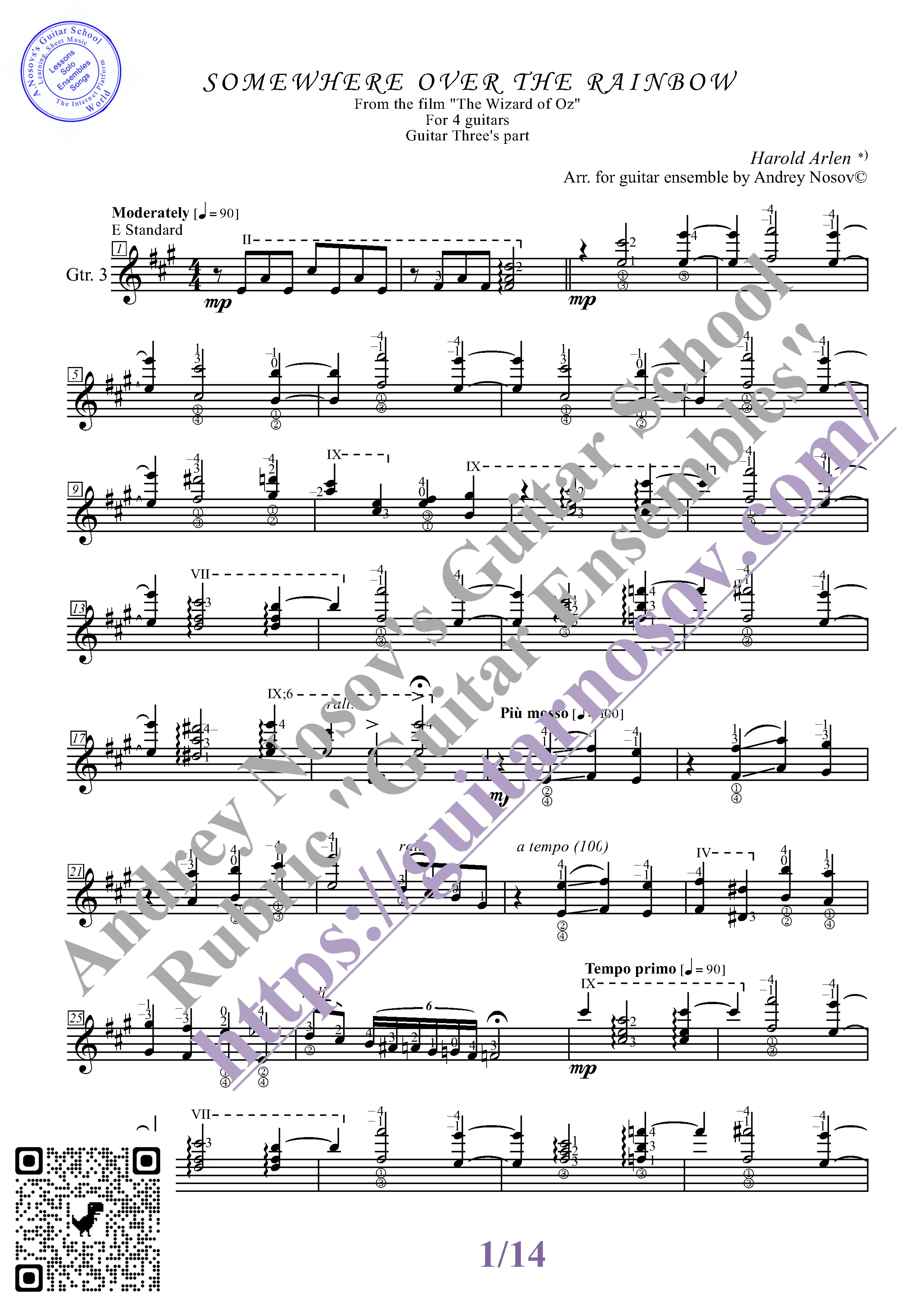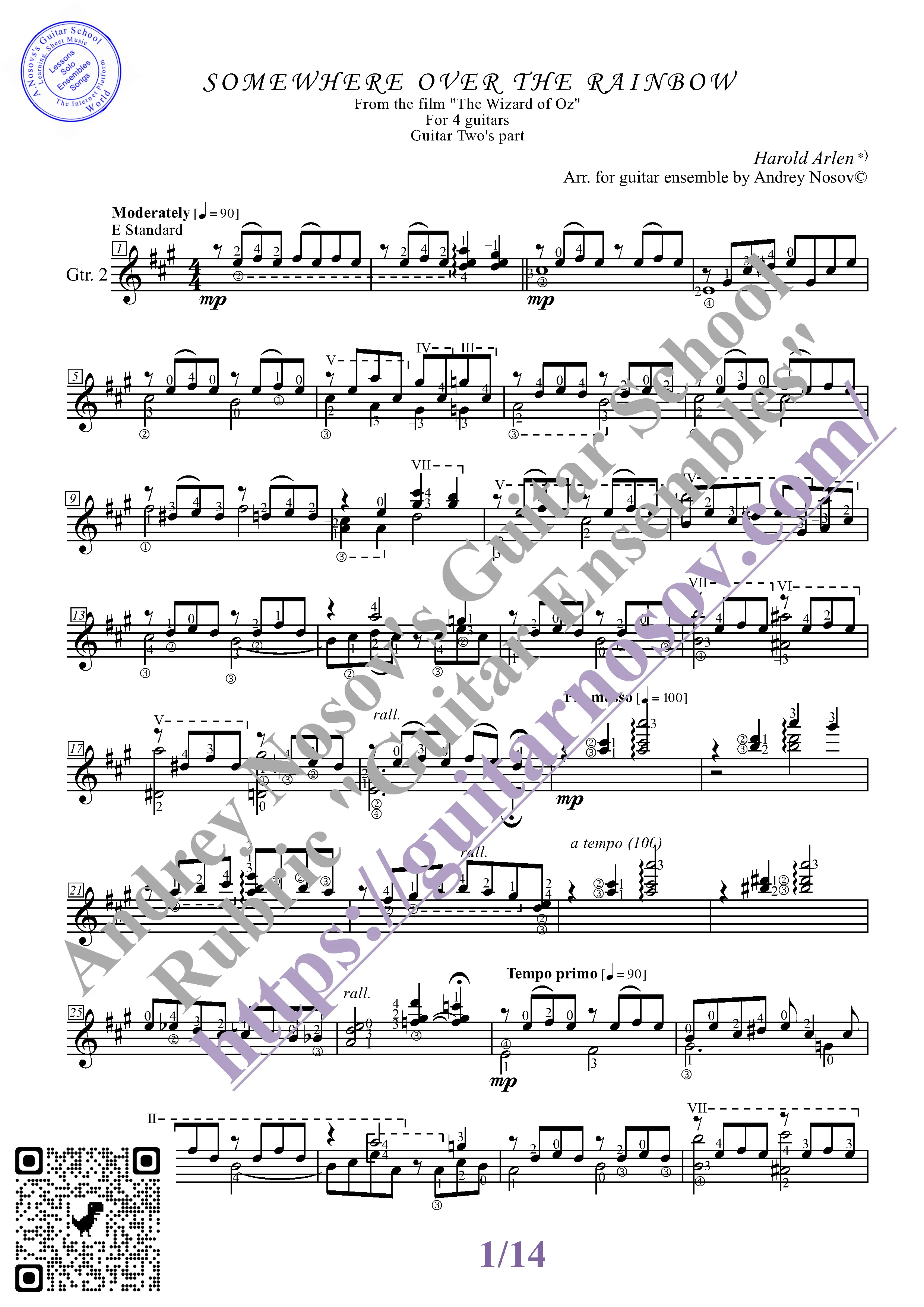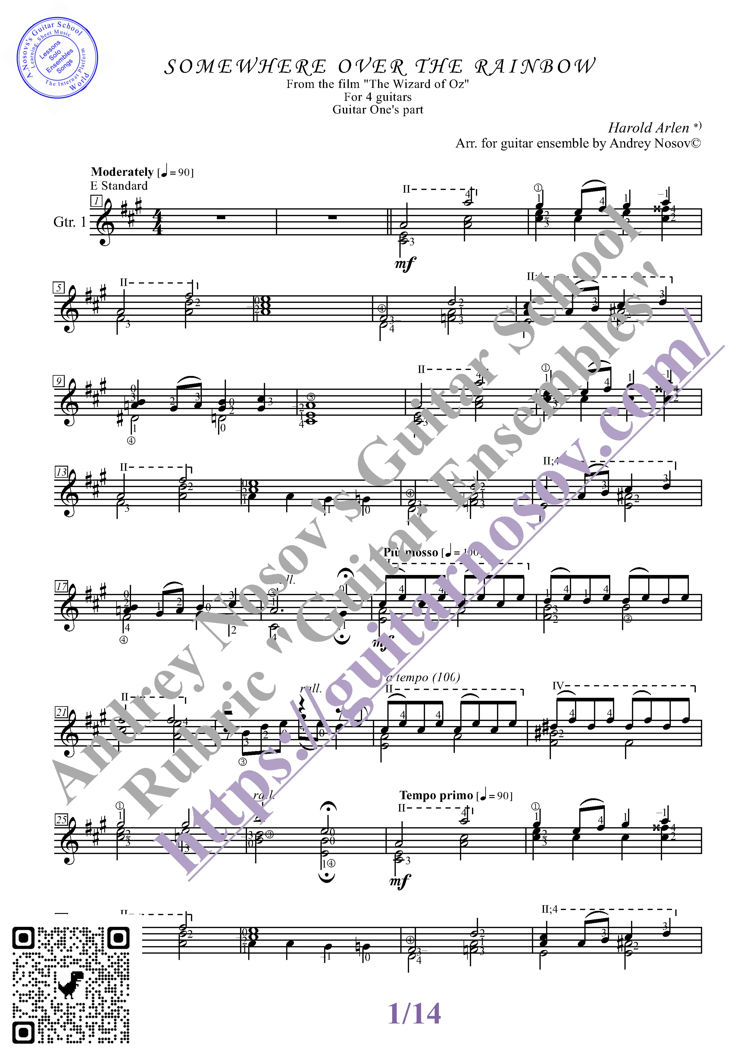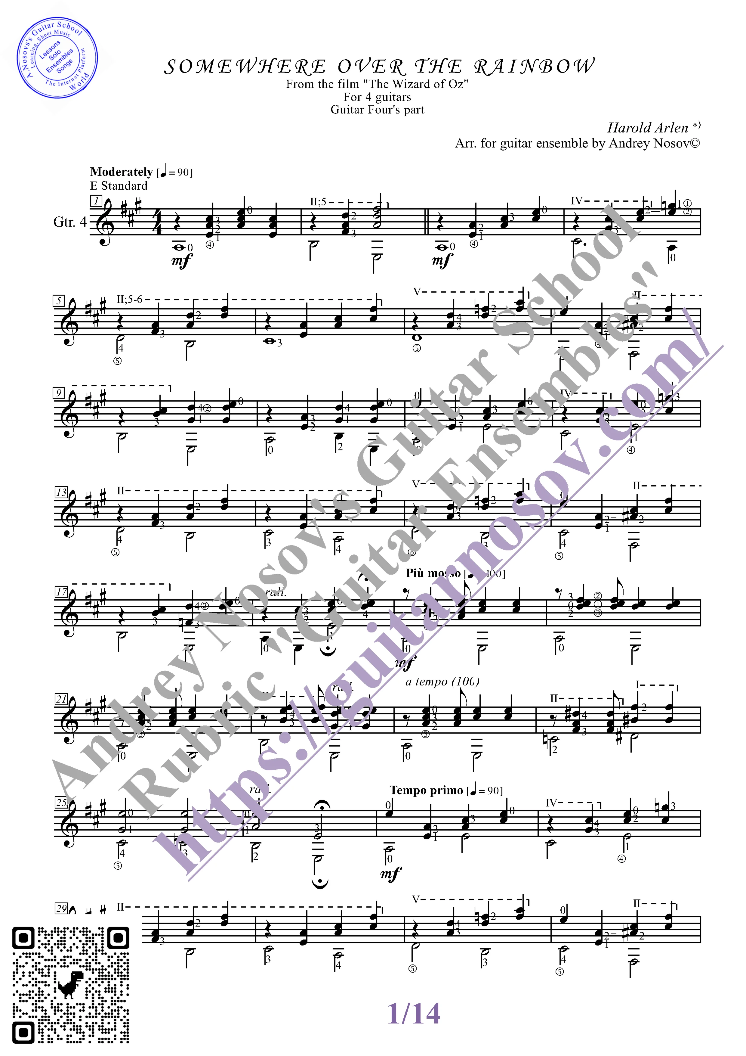 Вашему вниманию предлагается композиция "Somewhere over the Rainbow (H.Arlen)", предназначенная для КВАРТЕТА гитаристов. Запись выполнена нотами и сопровождена подробнейшей аппликатурой. Табулатуры нет. Товар включает в себя партитуру и партии отдельных гитар (в одном PDF). Прилагается ссылка на прослушивание / скачивание mp3.