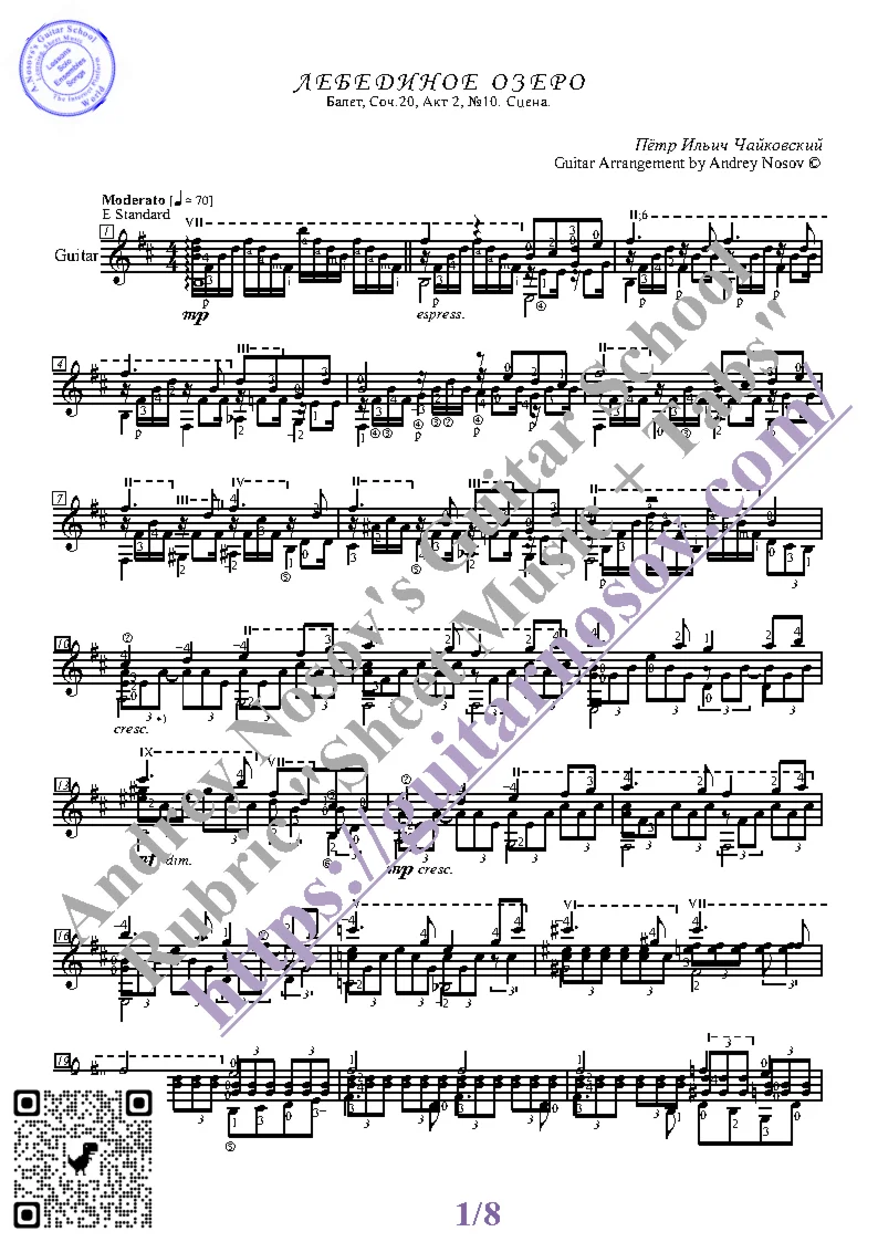 Вашему вниманию предлагается композиция "Лебединое озеро, Акт 2, №10, Сцена (П.Чайковский)", предназначенная для 6-ти струнной гитары СОЛО. Запись выполнена нотами, сопровождена подробнейшей аппликатурой и продублирована табулатурой. И ещё… Товар включает в себя ноты с табулатурой и без табулатуры (в одном PDF). Прилагается ссылка на прослушивание / скачивание mp3.