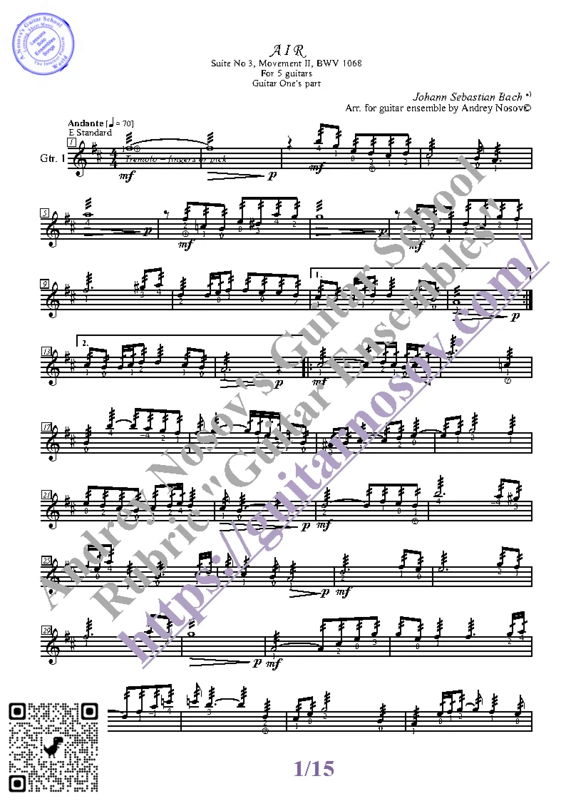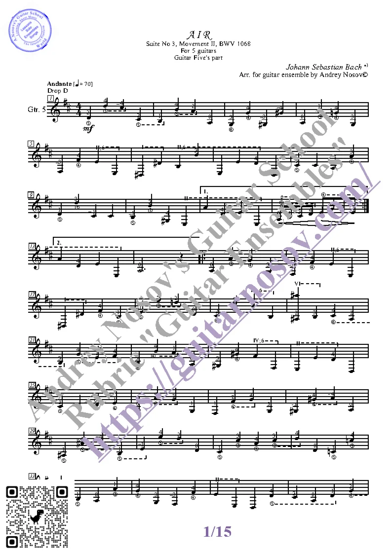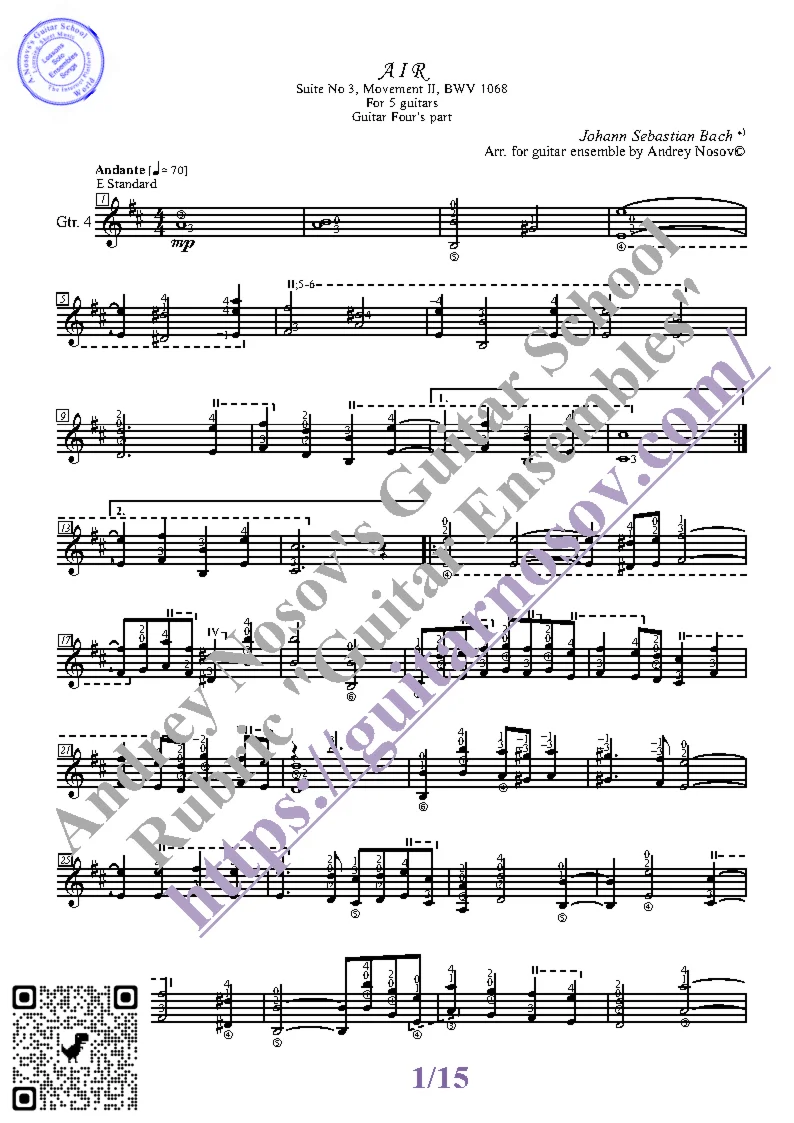 Вашему вниманию предлагается композиция "Aria_Suite No.3_BWV 1068 (J.S.Bach)", предназначенная для гитарного КВИНТЕТА. Запись выполнена нотами и сопровождена подробнейшей аппликатурой. Табулатуры нет. Товар включает в себя партитуру и партии отдельных гитар (в одном PDF). Прилагается ссылка на прослушивание / скачивание mp3.