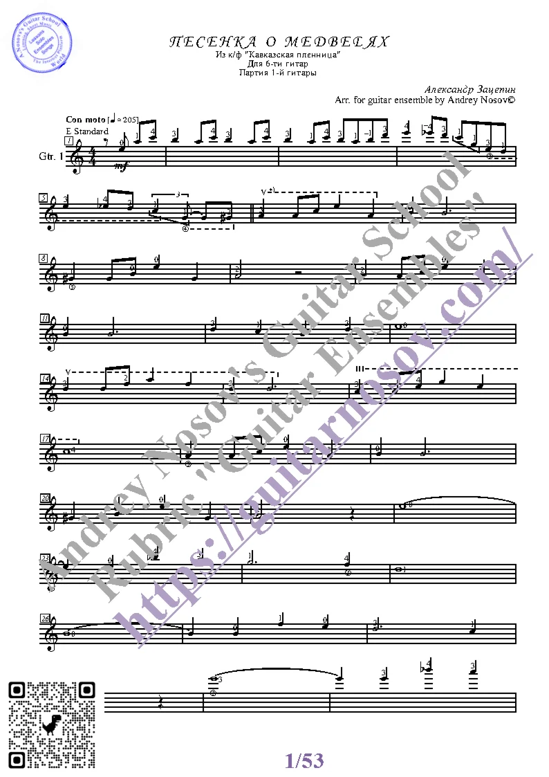 Вашему вниманию предлагается композиция "Песенка о медведях (А.Зацепин)", предназначенная для СЕКСТЕТА гитаристов. Запись выполнена нотами и сопровождена подробнейшей аппликатурой. Табулатуры нет. Товар включает в себя партитуру и партии отдельных гитар (в одном PDF). Прилагается ссылка на прослушивание / скачивание mp3.