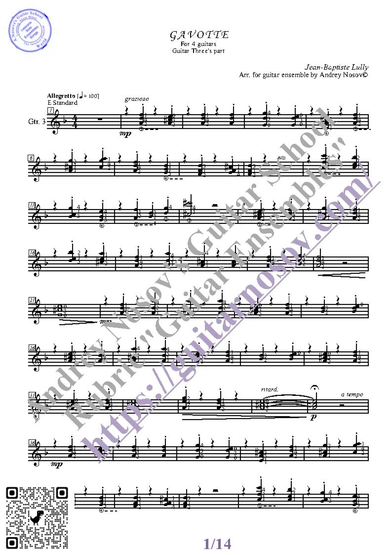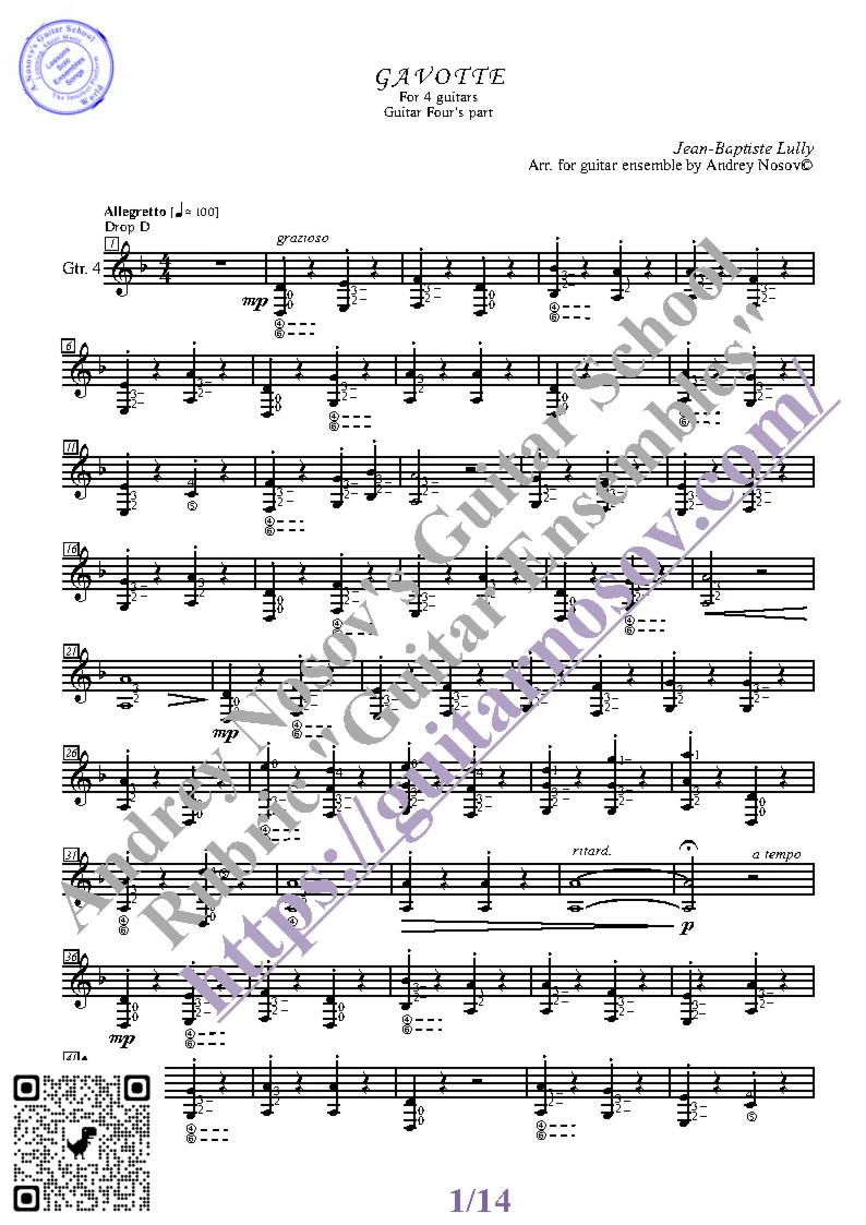 Вашему вниманию предлагается композиция "Gavotte (J-B. Lully)", предназначенная для КВАРТЕТА гитаристов. Запись выполнена нотами и сопровождена подробнейшей аппликатурой. Табулатуры нет. Товар включает в себя партитуру и партии отдельных гитар (в одном PDF). Прилагается ссылка на прослушивание / скачивание mp3.