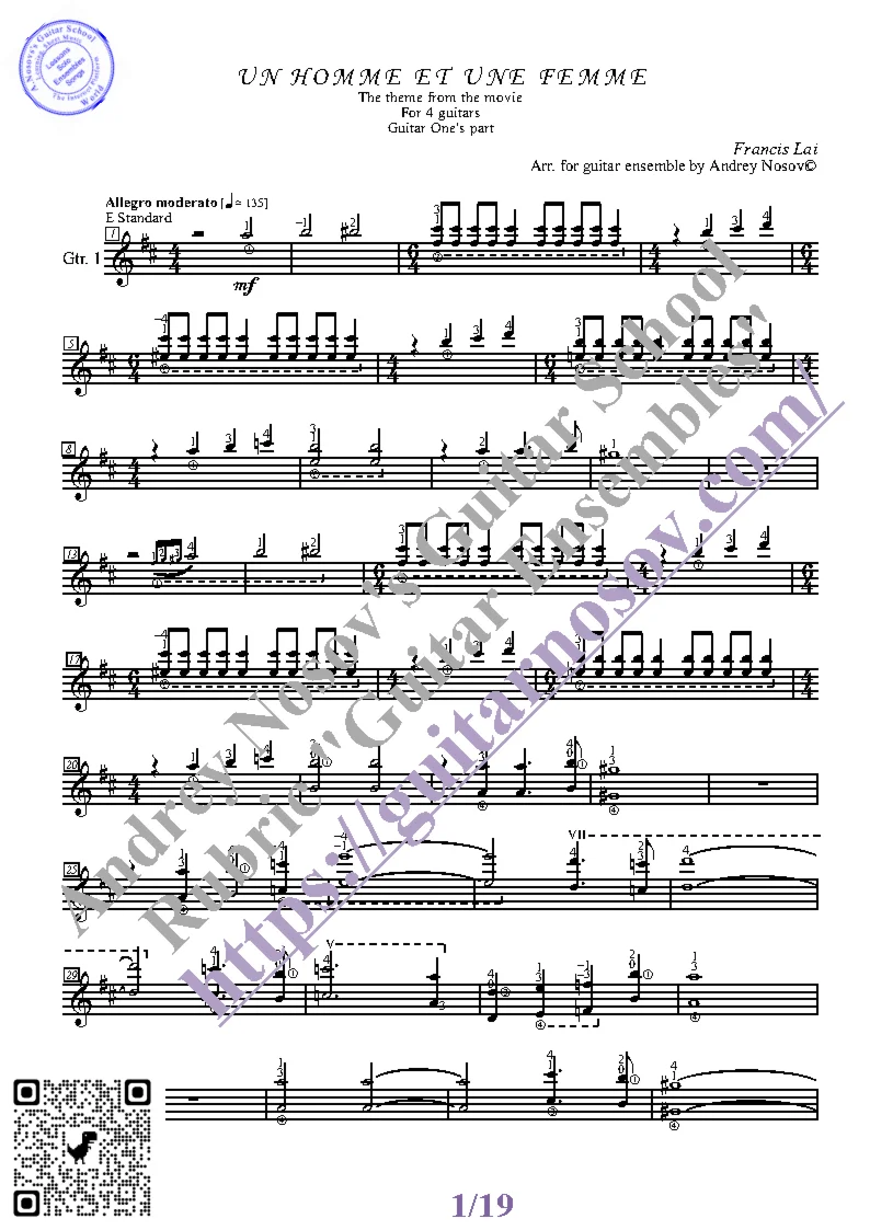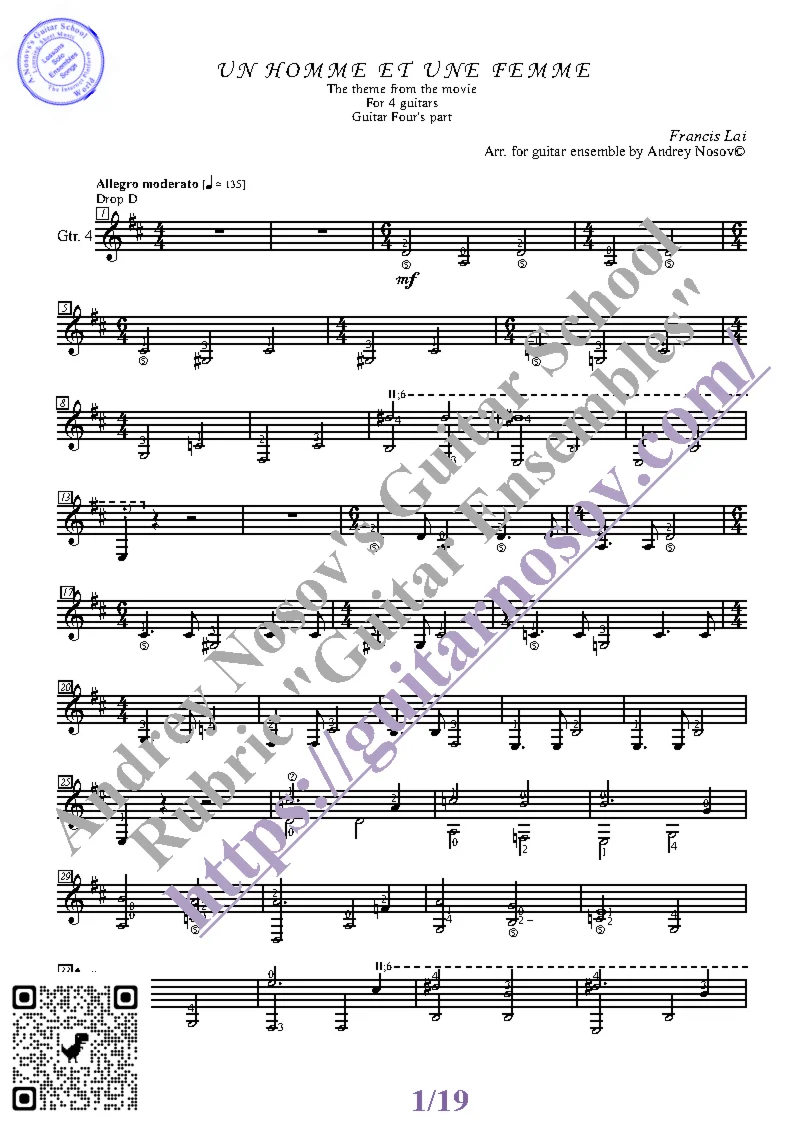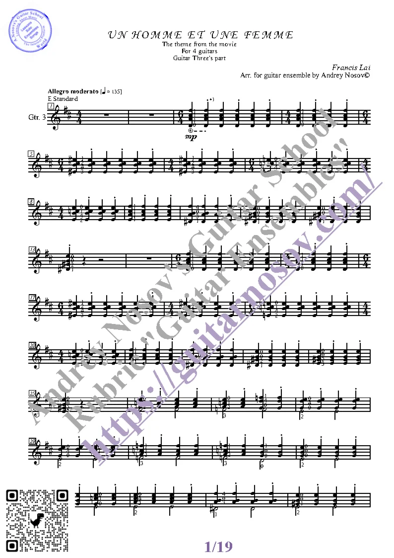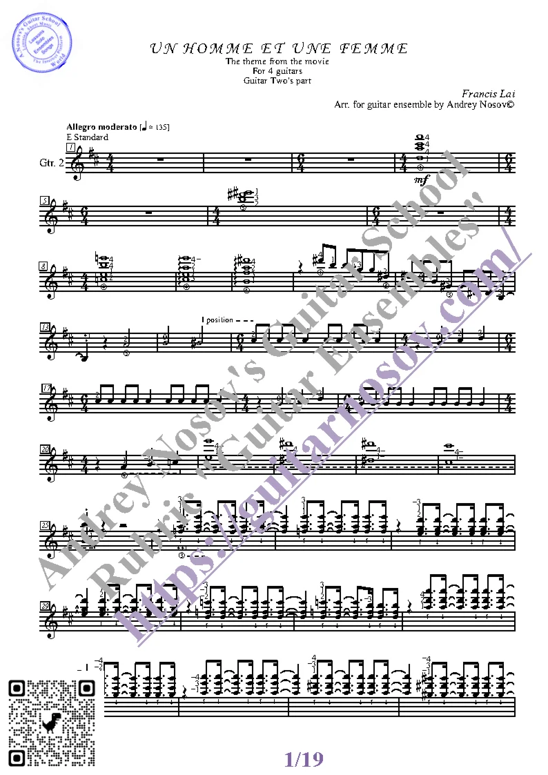 Вашему вниманию предлагается композиция "Un Homme et une Femme (F.Lai)", предназначенная для КВАРТЕТА гитаристов. Запись выполнена нотами и сопровождена подробнейшей аппликатурой. Табулатуры нет. Товар включает в себя партитуру и партии отдельных гитар (в одном PDF). Прилагается ссылка на прослушивание / скачивание mp3.