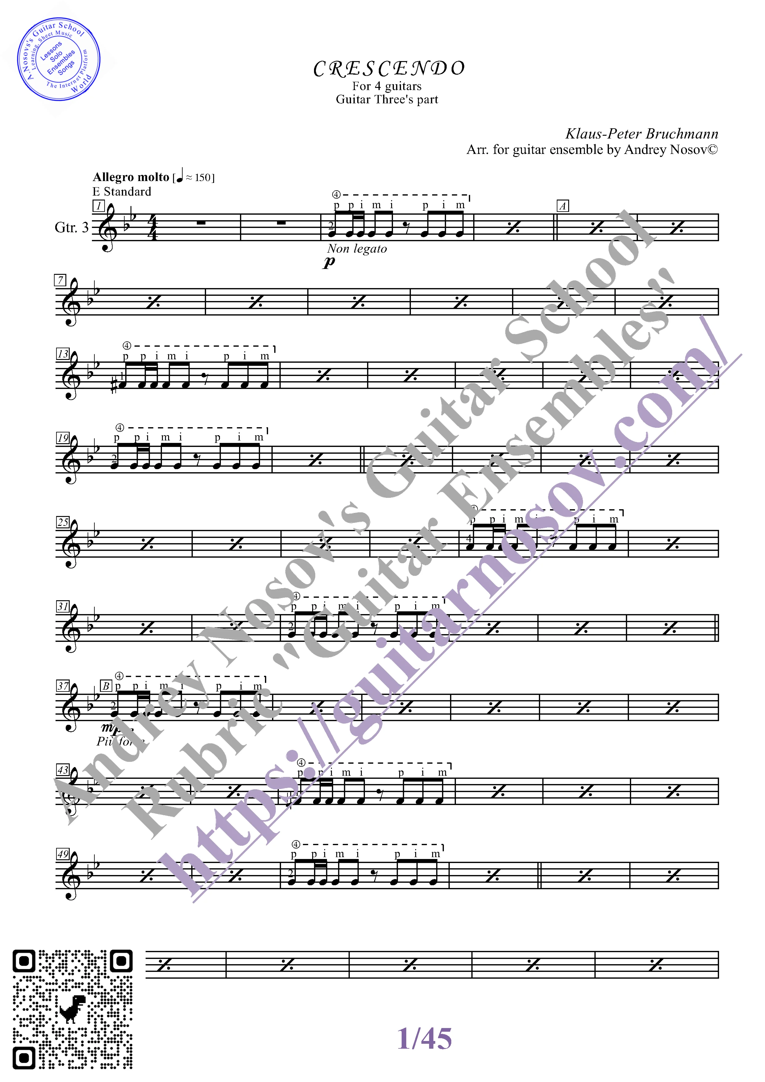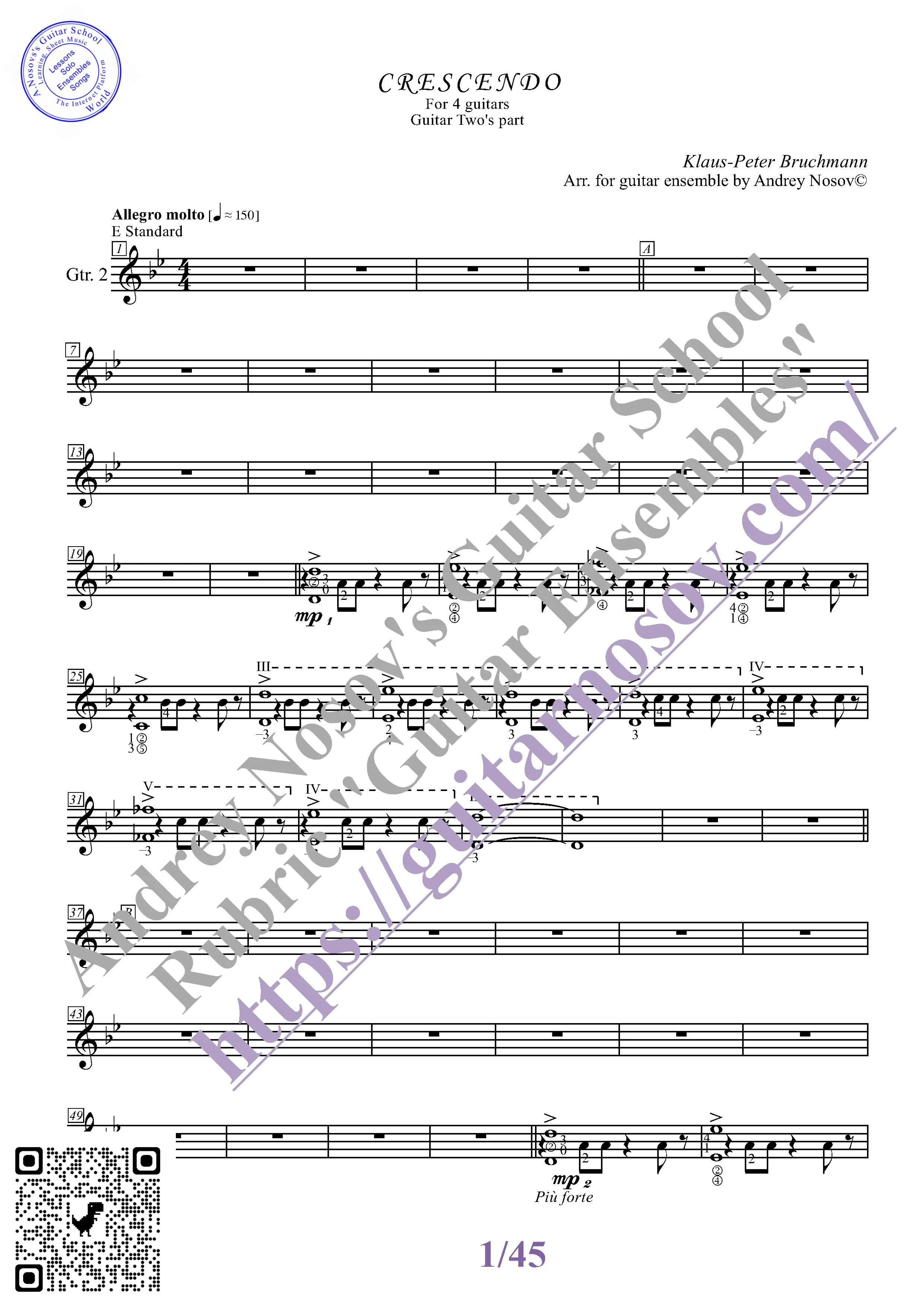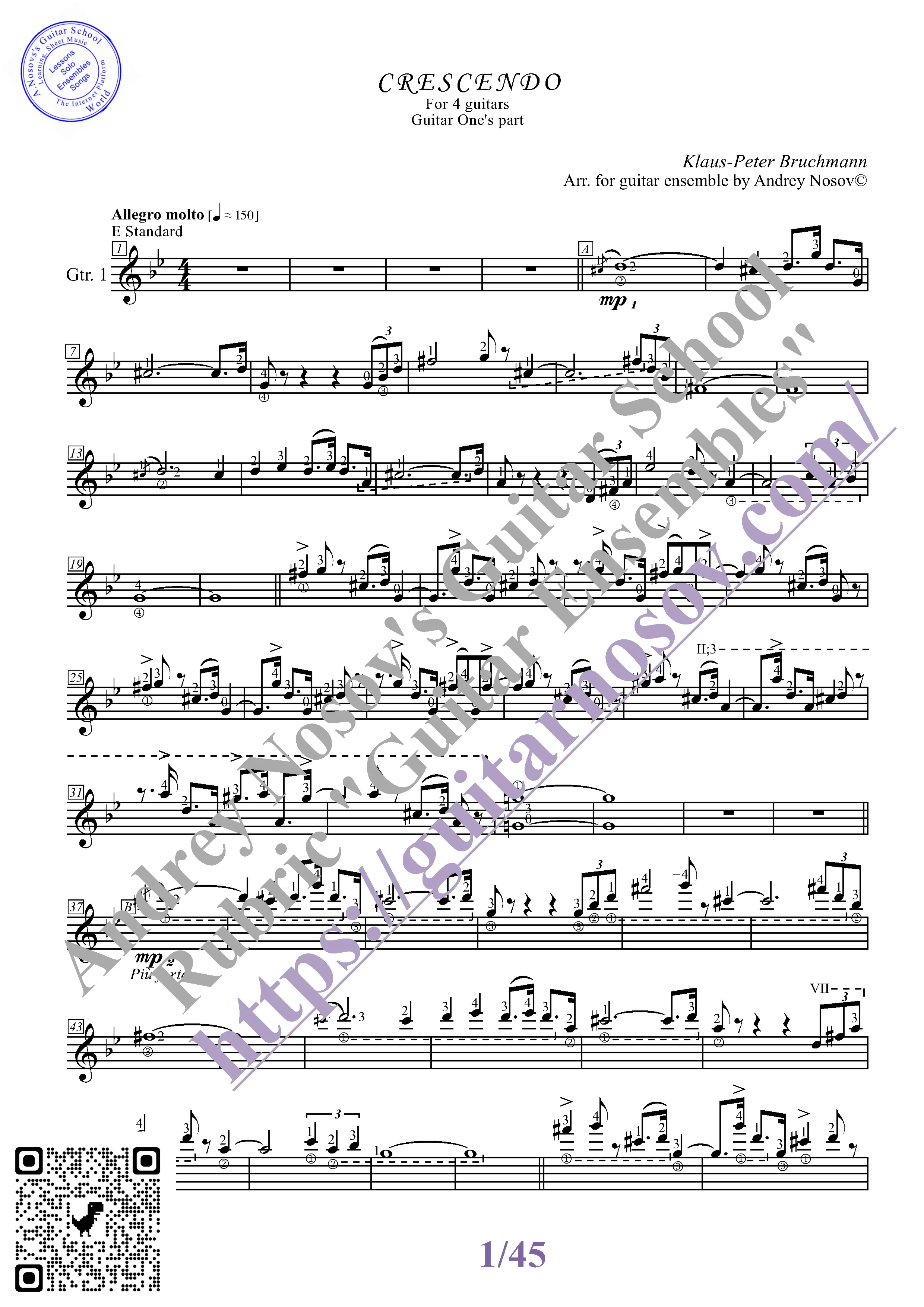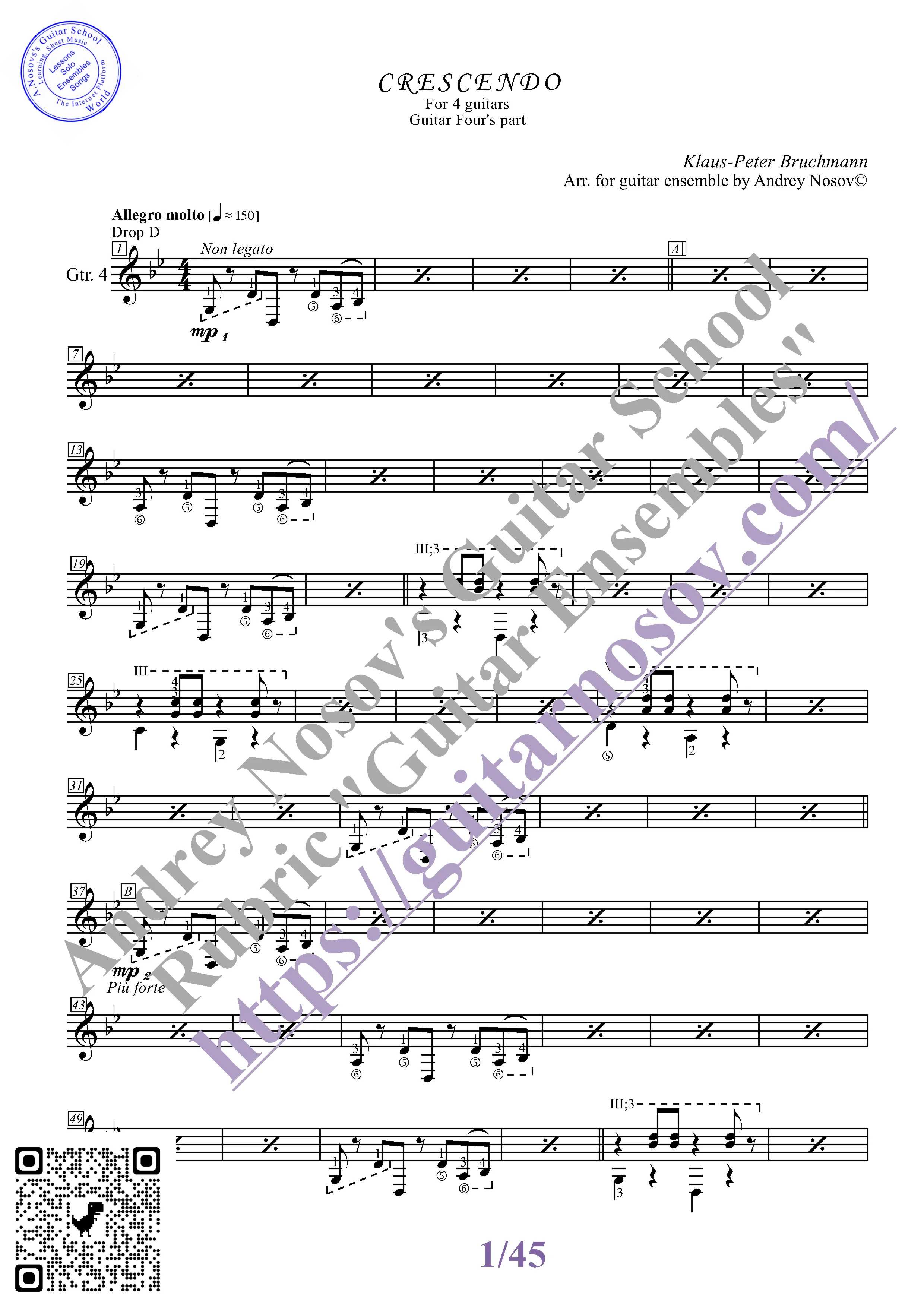 Вашему вниманию предлагается композиция "Crescendo (K.-P.Bruchmann)", предназначенная для КВАРТЕТА гитаристов. Запись выполнена нотами и сопровождена подробнейшей аппликатурой. Табулатуры нет. Товар включает в себя партитуру и партии отдельных гитар (в одном PDF). Прилагается ссылка на прослушивание / скачивание mp3.