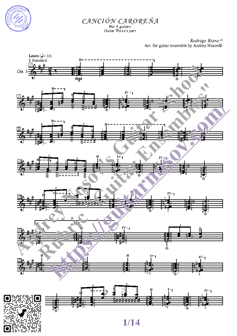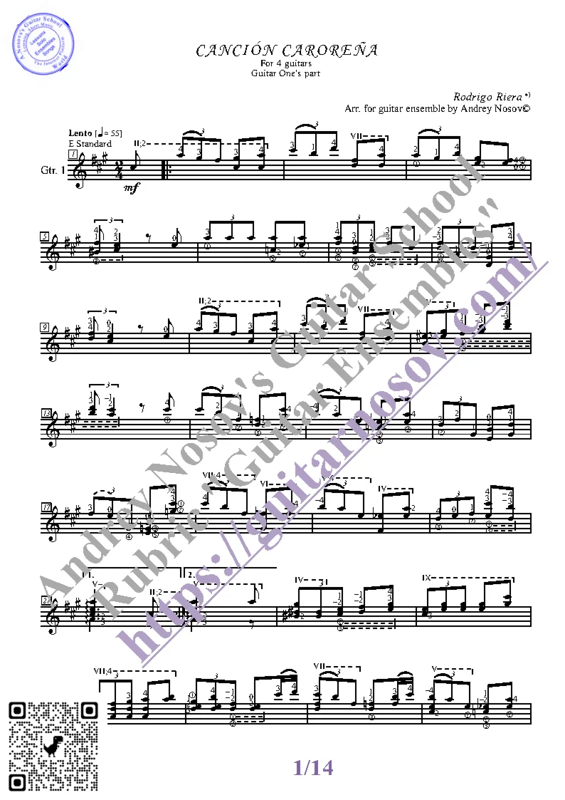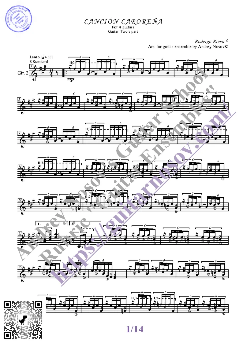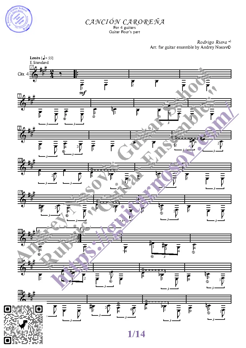 Вашему вниманию предлагается композиция "Cancion Carorena (R.Riera)", предназначенная для КВАРТЕТА гитаристов. Запись выполнена нотами и сопровождена подробнейшей аппликатурой. Табулатуры нет. Товар включает в себя партитуру и партии отдельных гитар (в одном PDF). Прилагается ссылка на прослушивание / скачивание mp3.