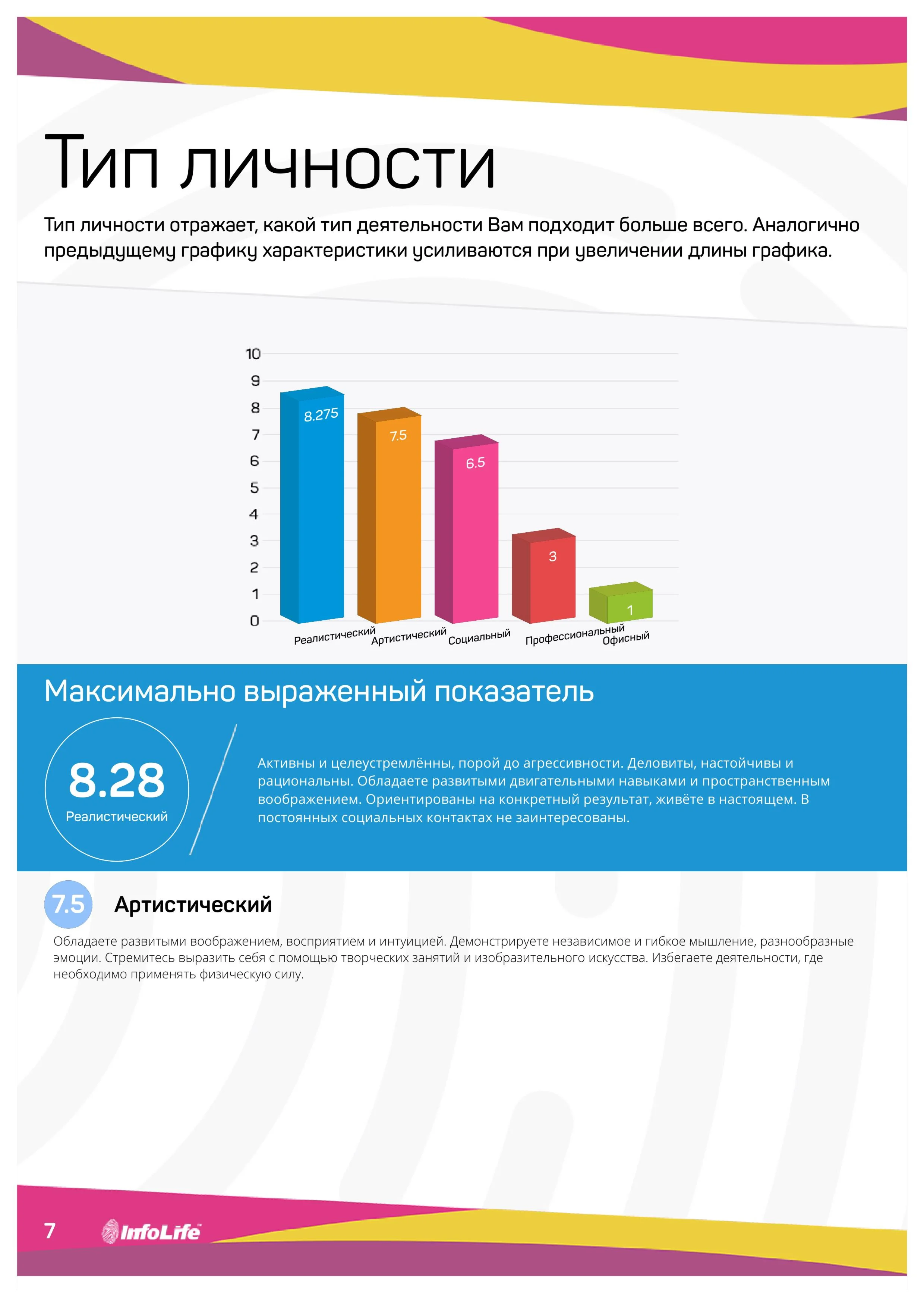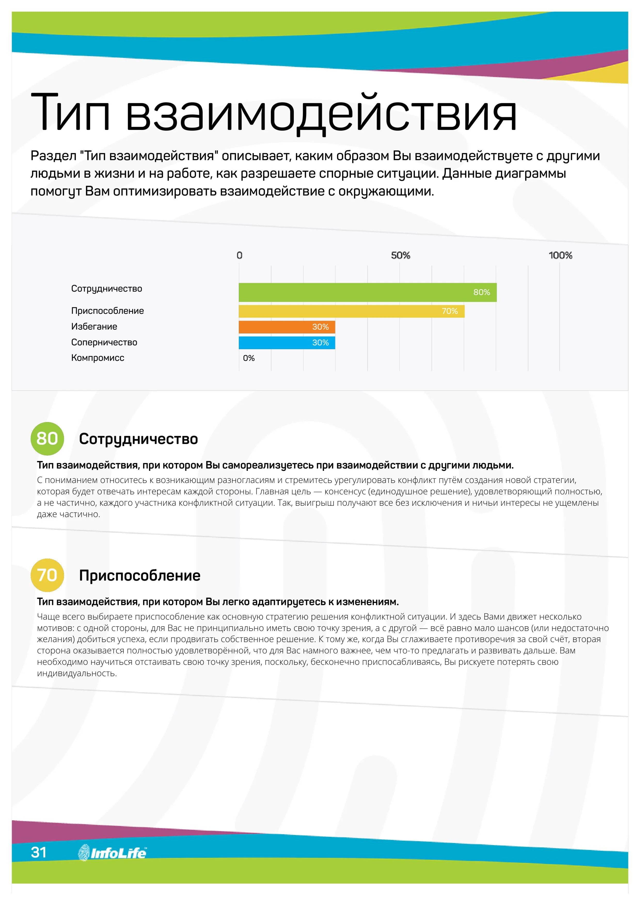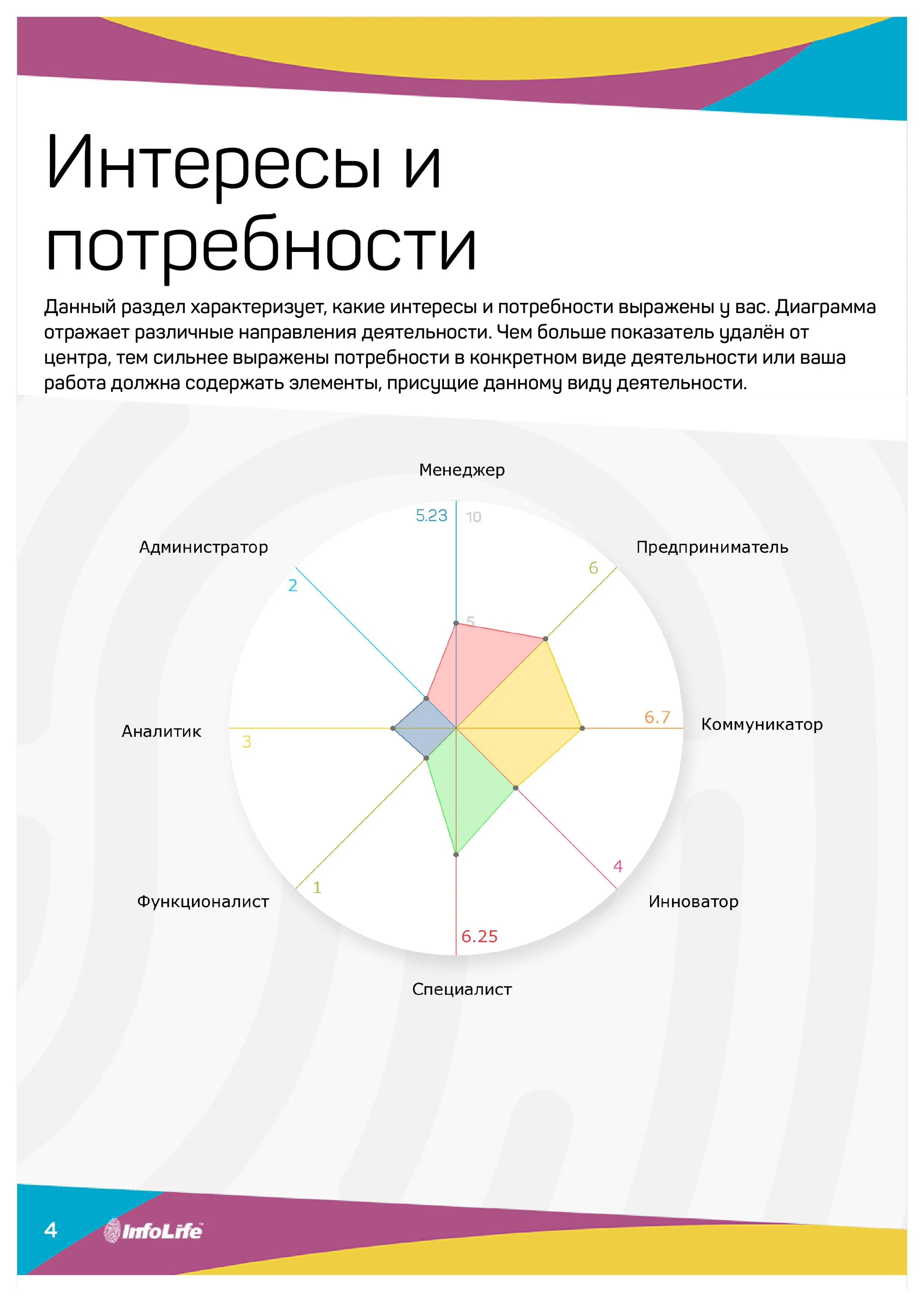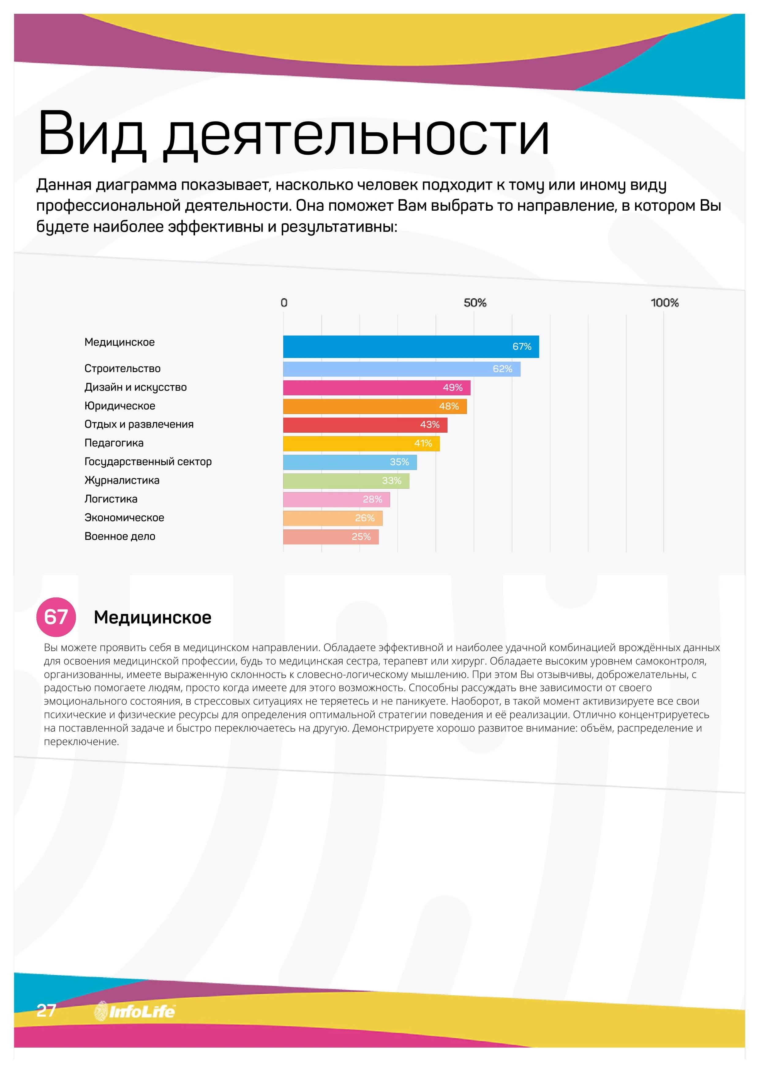 На основе данных биометрического тестирования будут даны рекомендации о том, какие направления деятельности для Вас комфортны, какой тип деятельности Вам подходит, какое образование предпочтительнее, в каком виде профессиональной деятельности Вы были бы успешней всего. Также описываются Ваш образ действий с окружающими и особенности взаимодействия в команде.