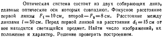 Оптическая система состоит из двух собирающих линз, главные оптические оси которых совпадают. Фокусное расстояние первой линзы F1 = 10 см, второй — F2 = 8 см. Расстояние между линзами l = 50 см. Перед первой линзой на расстоянии d1 = 15 cм от нее находится светящийся предмет. Найти число изображений, их положение и характер. Решение проверить построением.