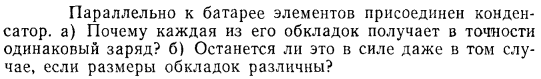 Параллельно к батарее элементов присоединен конденсатор, а) Почему каждая из его обкладок получает в точности одинаковый заряд? б) Останется ли это в силе даже в том случае, если размеры обкладок различны?