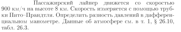 Пассажирский лайнер движется со скоростью 900 км/ч на высоте 8 км. Скорость измеряется с помощью трубки Пито-Прандтля. Определить разность давлений в дифференциальном манометре. Данные об атмосфере см. в т. 1, § 26.10, табл. 26.3.