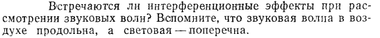 Встречаются ли интерференционные эффекты при рассмотрении звуковых волн? Вспомните, что звуковая волна в воздухе продольна, а световая — поперечна.
