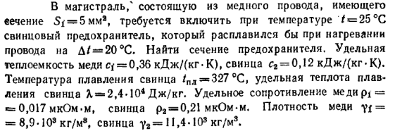 В магистраль, состоящую из медного провода, имеющего сечение S1 = 5 мм2, требуется включить при температуре t = 25°С свинцовый предохранитель, который расплавился бы при нагревании провода на dt = 20°С. Найти сечение предохранителя. Удельная теплоемкость меди с1 = 0,36 кДж/(кг·К), свинца с2 = 0,12 кДж/(кг·К). Температура плавления свинца tпл = 327°С, удельная теплота плавления свинца L = 2,4·104 Дж/кг. Удельное сопротивление меди p1 = 0,017 мкОм·м, свинца p2 = 0,21 мкОм·м. Плотность меди y1 = 8,9·103 кг/м3, свинца у2 = 11,4·103 кг/м3.