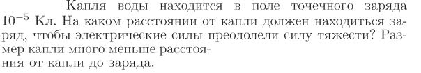 Капля воды находится в поле точечного заряда 10-5 Кл. На каком расстоянии от капли должен находиться заряд, чтобы электрические силы преодолели силу тяжести? Размер капли много меньше расстояния от капли до заряда.
