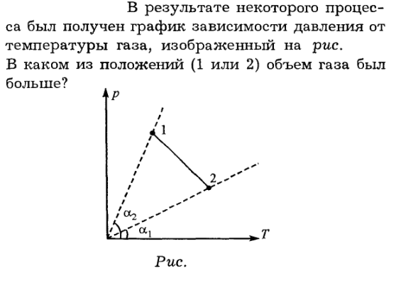 В результате некоторого процесса был получен график зависимости давления от температуры газа, изображенный на рис.. В каком из положений (1 или 2) объем газа был больше?