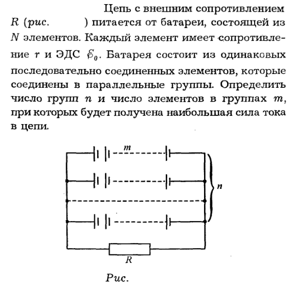 Цепь с внешним сопротивлением R (рис.) питается от батареи, состоящей из N элементов. Каждый элемент имеет сопротивление r и ЭДС E0. Батарея состоит из одинаковых последовательно соединенных элементов, которые соединены в параллельные группы. Определить число групп n и число элементов в группах m, при которых будет получена наибольшая сила тока в цепи.