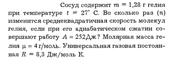 Сосуд содержит m = 1,28 г гелия при температуре t = 27° С. Во сколько раз (n) изменится среднеквадратичная скорость молекул гелия, если при его адиабатическом сжатии совершают работу А = 252 Дж? Молярная масса гелия ц = 4г/моль. Универсальная газовая постоянная R = 8,3 Дж/моль К.