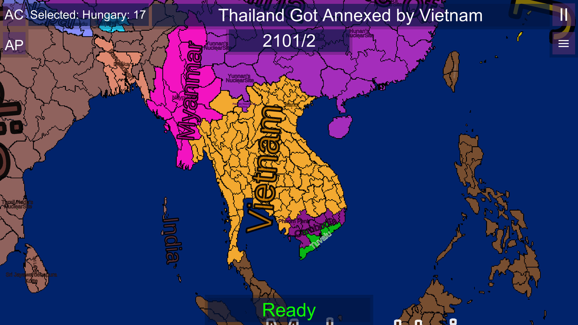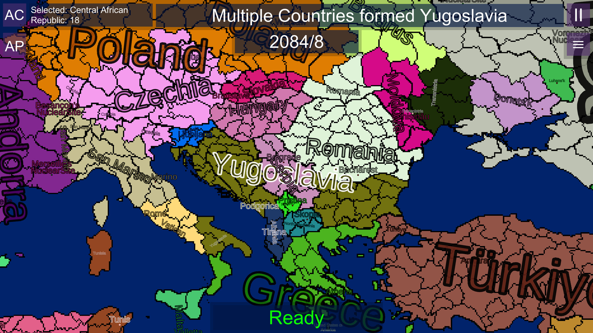 EarthRoyale is a Map simulation Observer game where the game each turn chooses one of many events to edit the world map