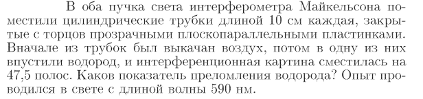 В оба пучка света интерферометра Майкельсона поместили цилиндрические трубки длиной 10 см каждая, закрытые с торцов прозрачными плоскопарадлельными пластинками. Вначале из трубок был выкачан воздух, потом в одну из них впустили водород, и интерференционная картина сместилась на 47,5 полос. Каков показатель преломления водорода? Опыт проводился в свете с длиной волны 590 нм.