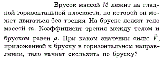 Брусок массой М лежит на гладкой горизонтальной плоскости, по которой он может двигаться без трения. На бруске лежит тело массой m. Коэффициент трения между телом и бруском равен ц. При каком значении силы F, приложенной к бруску в горизонтальном направлении, тело начнет скользить по бруску?