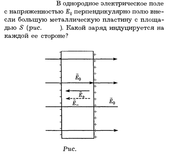В однородное электрическое поле с напряженностью E0 перпендикулярно полю внесли большую металлическую пластину с площадью S (рис. ). Какой заряд индуцируется на каждой ее стороне?