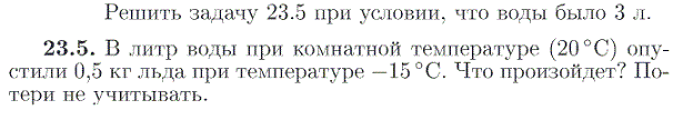 Репгать задачу 23.5 при условии, что воды было 3 л. 23.5. В литр воды при комнатной температуре (20 °С) опустили 0,5 кг льда при температуре —15 °С. Что произойдет? Потери не учитывать.