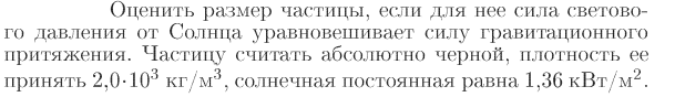 Оценить размер частицы, если для нее сила светового давления от Солнца уравновешивает силу гравитационного притяжения. Частицу считать абсолютно черной, плотность ее принять 2,0·103 кг/м3, солнечная постоянная равна 1,36 кВт/м2.