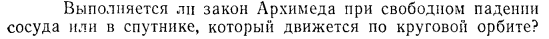 Выполняется ли закон Архимеда при свободном падении сосуда или в спутнике, который движется по круговой орбите?