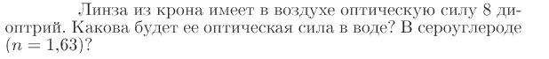 Линза из крона имеет в воздухе оптическую силу 8 диоптрий. Какова будет ее оптическая сила в воде? В сероуглероде (n=1,63)?