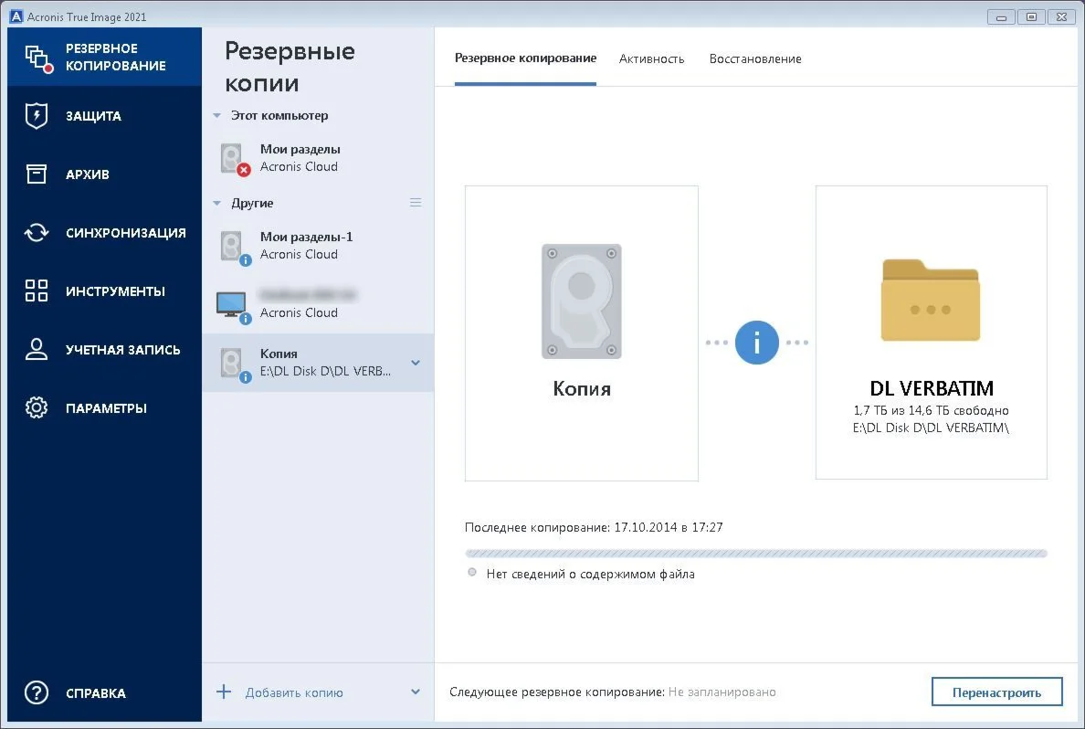 ????Гибкий выбор хранилища: локальные диски, сетевые папки, внешние накопители и облако Acronis Cloud.
