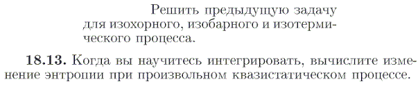 Решить предыдущую задачу для изохорного, изобарного и изотермического процесса. 18.13. Когда вы научитесь интегрировать, вычислите изменение энтропии при произвольном квазистатическом процессе.