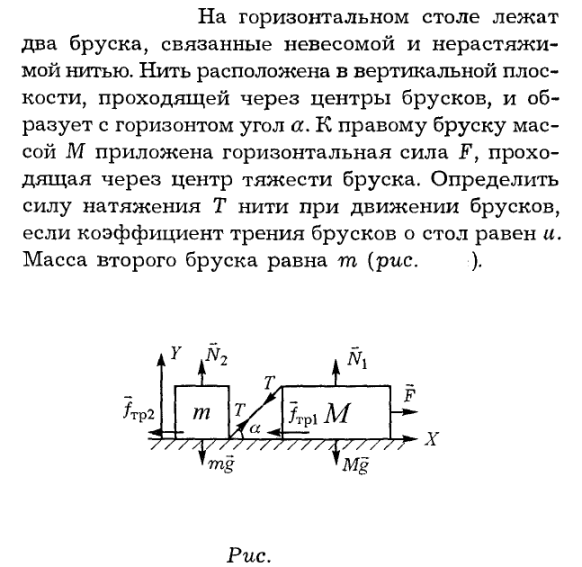 На горизонтальном столе лежат два бруска, связанные невесомой и нерастяжимой нитью. Нить расположена в вертикальной плоскости, проходящей через центры брусков, и образует с горизонтом угол а. К правому бруску массой М приложена горизонтальная сила F, проходящая через центр тяжести бруска. Определить силу натяжения Т нити при движении брусков, если коэффициент трения брусков о стол равен u. Масса второго бруска равна m (рис. ).