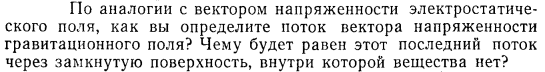 По аналогии с вектором напряженности электростатического поля, как вы определите поток вектора напряженности гравитационного поля? Чему будет равен этот последний поток через замкнутую поверхность, внутри которой вещества нет?