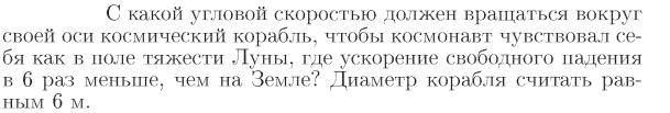 С какой угловой скоростью должен вращаться вокруг своей оси космический корабль, чтобы космонавт чувствовал себя как в иоле тяжести Луны, где ускорение свободного падения в 6 раз меньше, чем на Земле? Диаметр корабля считать равным 6 м.
