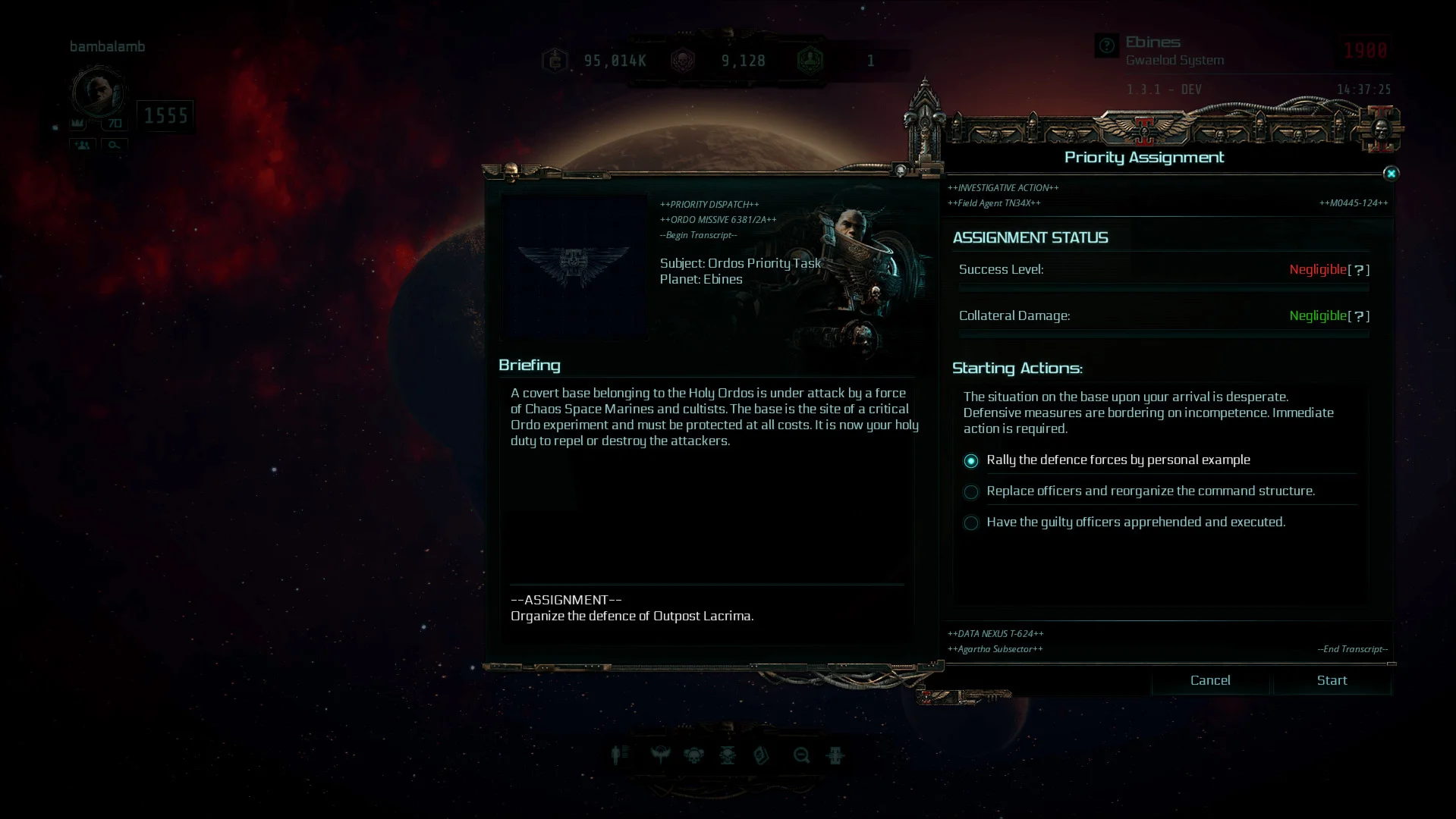 Секретная база Инквизиции подверглась нападению со стороны сил Хаоса. Стратегическая важность этого места требует, чтобы сертифицированный агент взял на себя командование и организовал оборону до прибытия помощи.