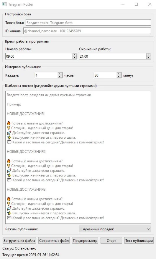 Бот умеет постить в заданное время и с заданным интервалом времени.