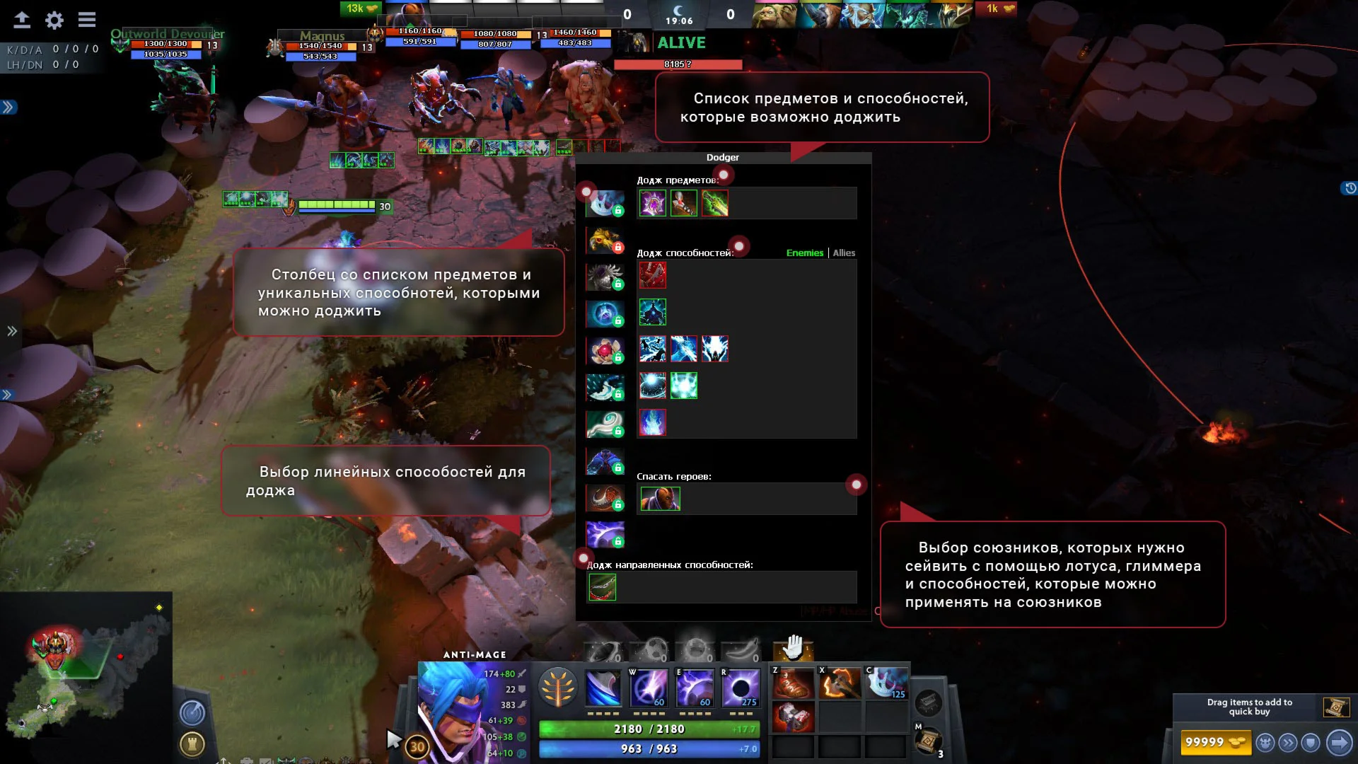 • Orb walker/Animation Cancel - При зажатии пробела, герой автоматически будет бить и идти в сторону вражеского героя не давая ему уйти.