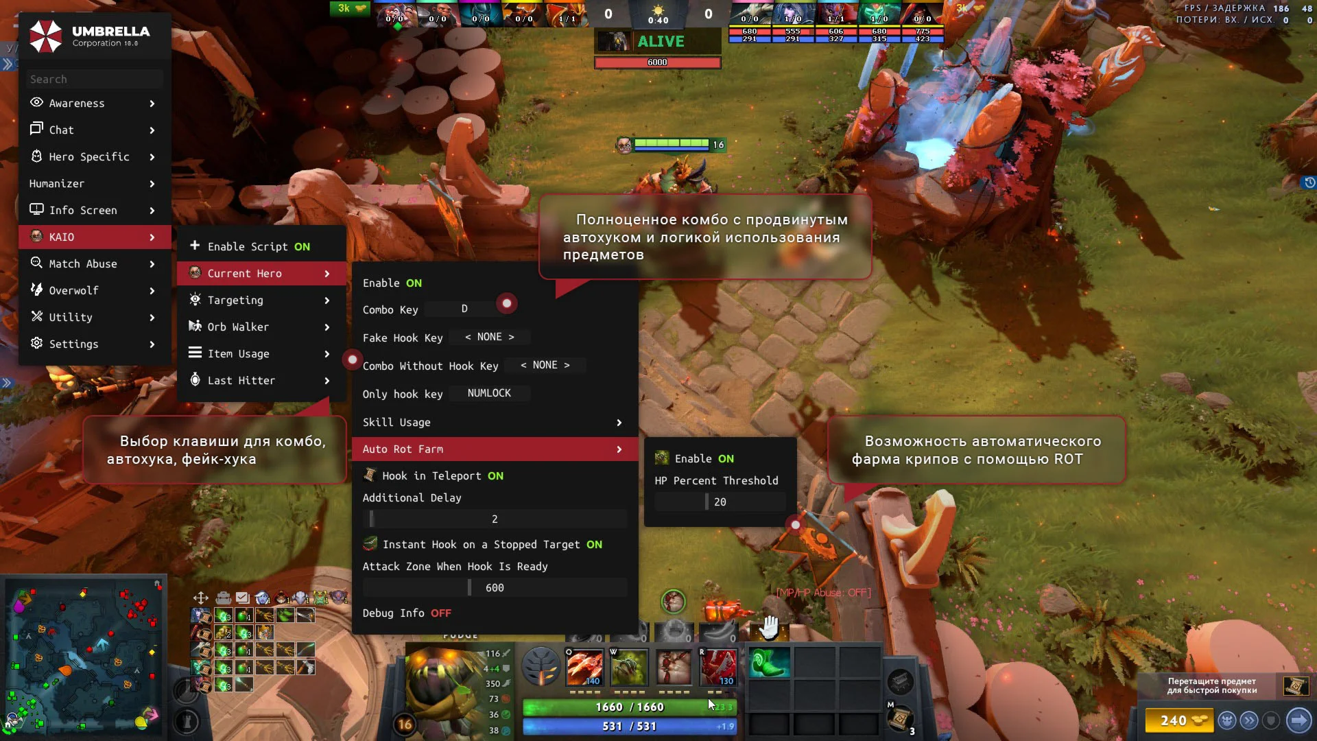 ????Авто-хук и всевозможные комбо на всех героев;
