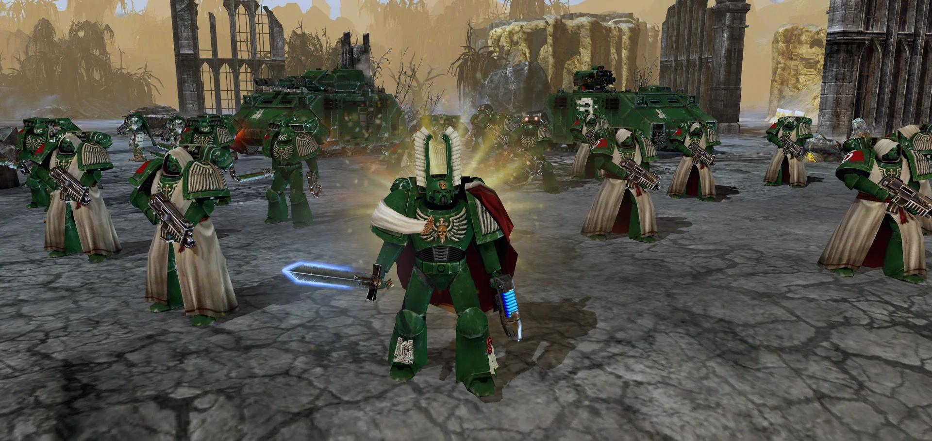 Dark Angels Pack добавляет в Warhammer® 40,000®: Dawn of War® II: Retribution™ культовый орден Космических десантников, изменяя внешний вид восьми основных юнитов и, конечно, добавляя в игру новые варианты покраски. Командор заменен на Магистра роты Темных Ангелов в украшенном крыльями шлеме, воины Тактического отделения облачаются в знаменитые робы Темных Ангелов. Отряды Разведчиков, Штурмовиков, Терминаторов и боевые машины Космодесанта также приобретают отличительные черты ордена.